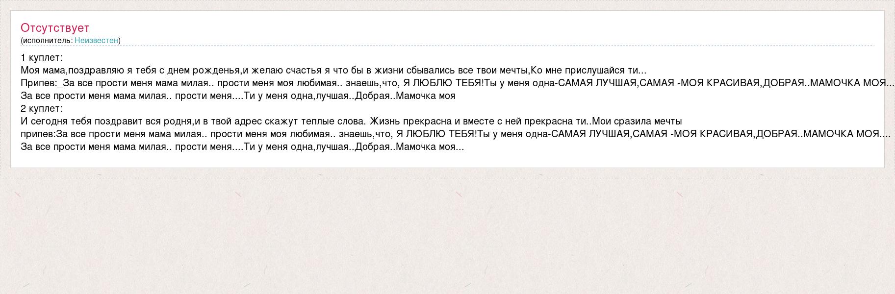 1 куплет: Моя мама,поздравляю я тебя с днем рожденья,и желаю счастья я что бы в жизни сбывались все твои мечты,Ко мне прислушайся ти... Припев:_За все прости меня мама милая.. прости меня моя любимая.. знаешь,что, Я ЛЮБЛЮ ТЕБЯ!Ты у меня одна-САМАЯ ЛУЧШАЯ,САМАЯ -МОЯ КРАСИВАЯ,ДОБРАЯ..МАМОЧКА МОЯ... За все прости меня мама милая.. прости меня....Ти у меня одна,лучшая..Добрая..Мамочка моя 2 куплет: И сегодня тебя поздравит вся родня,и в твой адрес скажут теплые слова. Жизнь прекрасна и вместе с ней прекрасна ти..Мои сразила мечты припев:За все прости меня мама милая.. прости меня моя любимая.. знаешь,что, Я ЛЮБЛЮ ТЕБЯ!Ты у меня одна-САМАЯ ЛУЧШАЯ,САМАЯ -МОЯ КРАСИВАЯ,ДОБРАЯ..МАМОЧКА МОЯ.... За все прости меня мама милая.. прости меня....Ти у меня одна,лучшая..Добрая..Мамочка моя...