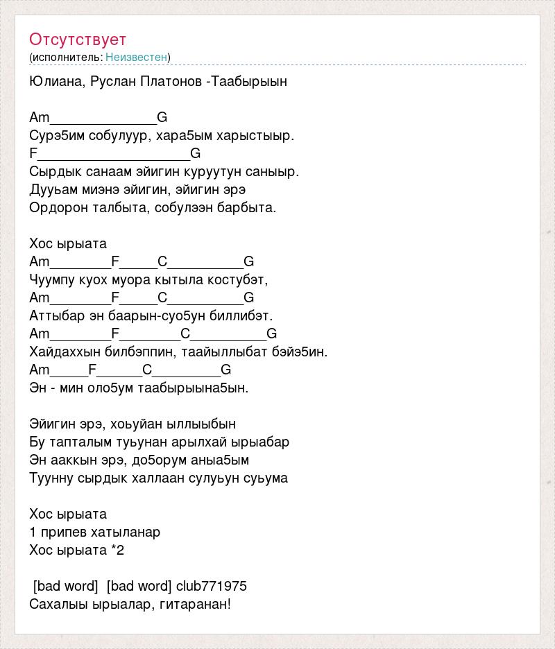 Юлиана, Руслан Платонов -Таабырыын Am______________G Сурэ5им собулуур, хара5ым харыстыыр. F____________________G Сырдык санаам эйигин куруутун саныыр. Дууьам миэнэ эйигин, эйигин эрэ Ордорон талбыта, собулээн барбыта. Хос ырыата Am________F_____C__________G Чуумпу куох муора кытыла костубэт, Am________F_____C__________G Аттыбар эн баарын-суо5ун биллибэт. Am________F________C__________G Хайдаххын билбэппин, таайыллыбат бэйэ5ин. Am_____F______C_________G Эн - мин оло5ум таабырыына5ын. Эйигин эрэ, хоьуйан ыллыыбын Бу тапталым туьунан арылхай ырыабар Эн ааккын эрэ, до5орум аныа5ым Туунну сырдык халлаан сулуьун суьума Хос ырыата 1 припев хатыланар Хос ырыата *2 [bad word] [bad word] club771975 Сахалыы ырыалар, гитаранан!
