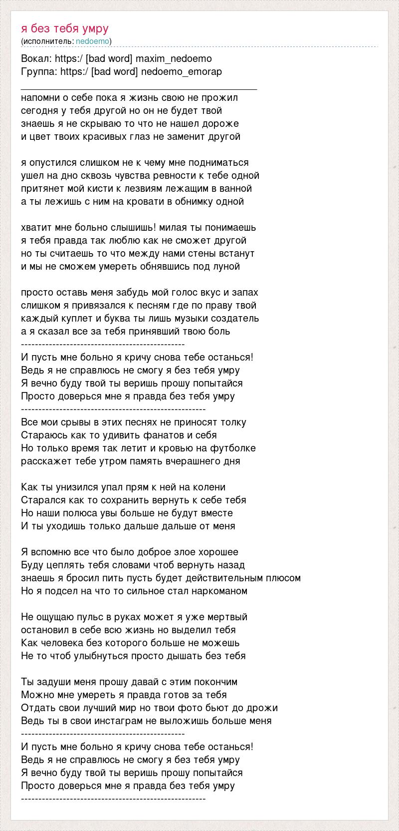 Вокал: https:/ [bad word] maxim_nedoemo Группа: https:/ [bad word] nedoemo_emorap ___________________________________________ напомни о себе пока я жизнь свою не прожил сегодня у тебя другой но он не будет твой знаешь я не скрываю то что не нашел дороже и цвет твоих красивых глаз не заменит другой я опустился слишком не к чему мне подниматься ушел на дно сквозь чувства ревности к тебе одной притянет мой кисти к лезвиям лежащим в ванной а ты лежишь с ним на кровати в обнимку одной хватит мне больно слышишь! милая ты понимаешь я тебя правда так люблю как не сможет другой но ты считаешь то что между нами стены встанут и мы не сможем умереть обнявшись под луной просто оставь меня забудь мой голос вкус и запах слишком я привязался к песням где по праву твой каждый куплет и буква ты лишь музыки создатель а я сказал все за тебя принявший твою боль ----------------------------------------------- И пусть мне больно я кричу снова тебе останься! Ведь я не справлюсь не смогу я без тебя умру Я вечно буду твой ты веришь прошу попытайся Просто доверься мне я правда без тебя умру ----------------------------------------------------- Все мои срывы в этих песнях не приносят толку Стараюсь как то удивить фанатов и себя Но только время так летит и кровью на футболке расскажет тебе утром память вчерашнего дня Как ты унизился упал прям к ней на колени Старался как то сохранить вернуть к себе тебя Но наши полюса увы больше не будут вместе И ты уходишь только дальше дальше от меня Я вспомню все что было доброе злое хорошее Буду цеплять тебя словами чтоб вернуть назад знаешь я бросил пить пусть будет действительным плюсом Но я подсел на что то сильное стал наркоманом Не ощущаю пульс в руках может я уже мертвый остановил в себе всю жизнь но выделил тебя Как человека без которого больше не можешь Не то чтоб улыбнуться просто дышать без тебя Ты задуши меня прошу давай с этим покончим Можно мне умереть я правда готов за тебя Отдать свои лучший мир но твои фото бьют до дрожи Ведь ты в свои инстаграм не выложишь больше меня ----------------------------------------------- И пусть мне больно я кричу снова тебе останься! Ведь я не справлюсь не смогу я без тебя умру Я вечно буду твой ты веришь прошу попытайся Просто доверься мне я правда без тебя умру -----------------------------------------------------