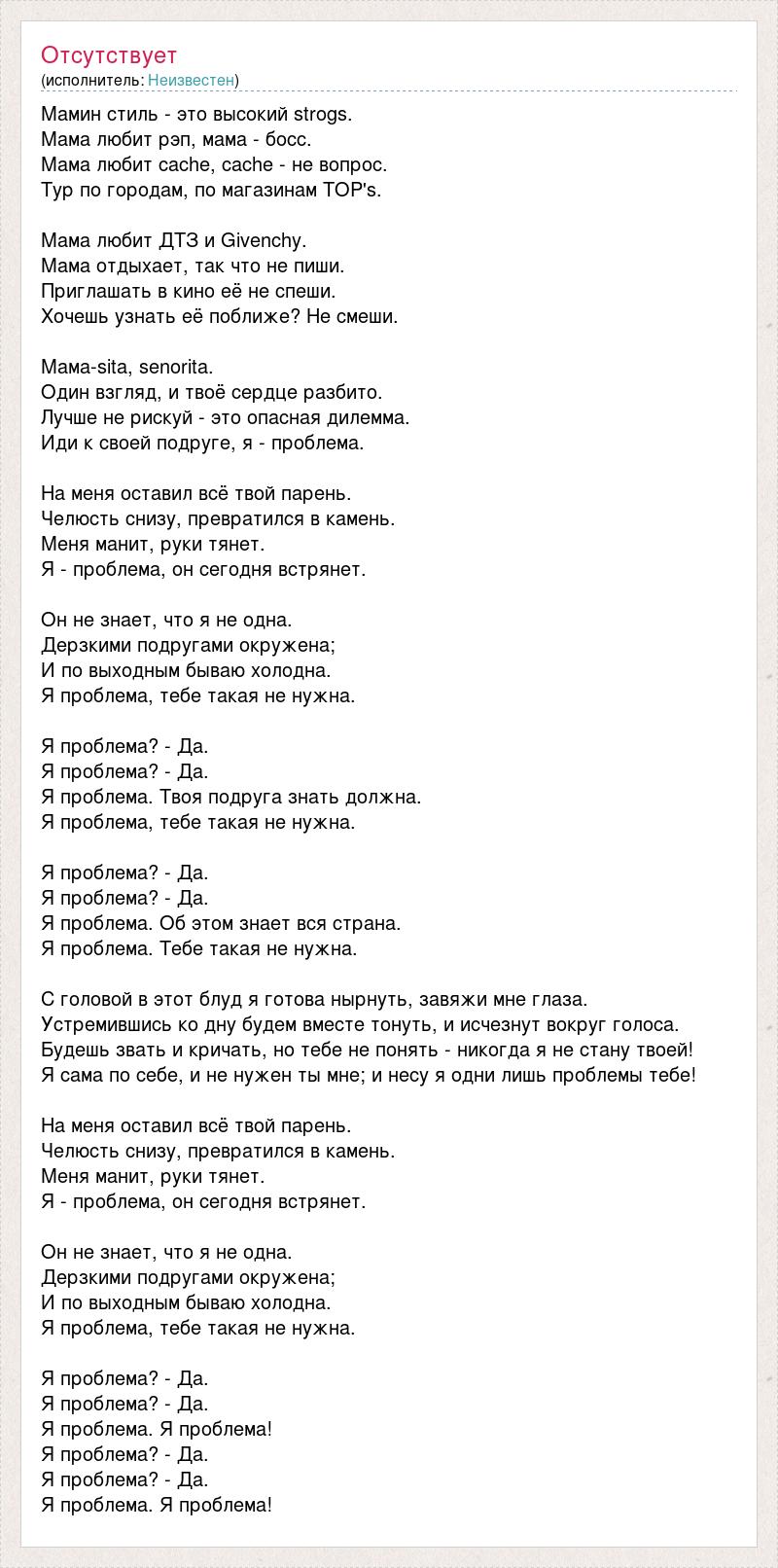 Мамин стиль - это высокий strogs. Мама любит рэп, мама - босс. Мама любит cache, cache - не вопрос. Тур по городам, по магазинам TOP's. Мама любит ДТЗ и Givenchy. Мама отдыхает, так что не пиши. Приглашать в кино её не спеши. Хочешь узнать её поближе? Не смеши. Мама-sita, senorita. Один взгляд, и твоё сердце разбито. Лучше не рискуй - это опасная дилемма. Иди к своей подруге, я - проблема. На меня оставил всё твой парень. Челюсть снизу, превратился в камень. Меня манит, руки тянет. Я - проблема, он сегодня встрянет. Он не знает, что я не одна. Дерзкими подругами окружена; И по выходным бываю холодна. Я проблема, тебе такая не нужна. Я проблема? - Да. Я проблема? - Да. Я проблема. Твоя подруга знать должна. Я проблема, тебе такая не нужна. Я проблема? - Да. Я проблема? - Да. Я проблема. Об этом знает вся страна. Я проблема. Тебе такая не нужна. С головой в этот блуд я готова нырнуть, завяжи мне глаза. Устремившись ко дну будем вместе тонуть, и исчезнут вокруг голоса. Будешь звать и кричать, но тебе не понять - никогда я не стану твоей! Я сама по себе, и не нужен ты мне; и несу я одни лишь проблемы тебе! На меня оставил всё твой парень. Челюсть снизу, превратился в камень. Меня манит, руки тянет. Я - проблема, он сегодня встрянет. Он не знает, что я не одна. Дерзкими подругами окружена; И по выходным бываю холодна. Я проблема, тебе такая не нужна. Я проблема? - Да. Я проблема? - Да. Я проблема. Я проблема! Я проблема? - Да. Я проблема? - Да. Я проблема. Я проблема!