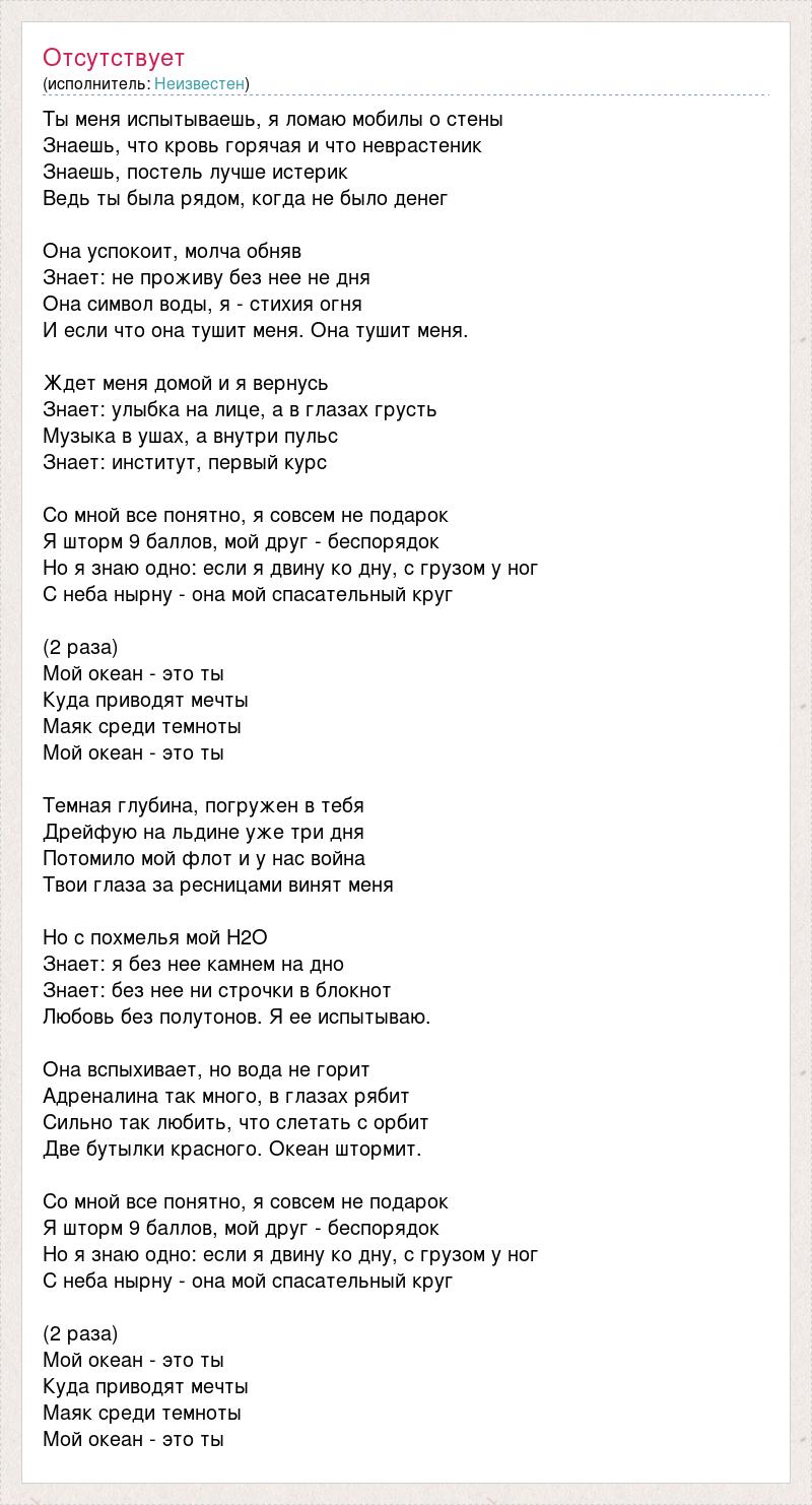 Ты меня испытываешь, я ломаю мобилы о стены Знаешь, что кровь горячая и что неврастеник Знаешь, постель лучше истерик Ведь ты была рядом, когда не было денег Она успокоит, молча обняв Знает: не проживу без нее не дня Она символ воды, я - стихия огня И если что она тушит меня. Она тушит меня. Ждет меня домой и я вернусь Знает: улыбка на лице, а в глазах грусть Музыка в ушах, а внутри пульс Знает: институт, первый курс Со мной все понятно, я совсем не подарок Я шторм 9 баллов, мой друг - беспорядок Но я знаю одно: если я двину ко дну, с грузом у ног С неба нырну - она мой спасательный круг (2 раза) Мой океан - это ты Куда приводят мечты Маяк среди темноты Мой океан - это ты Темная глубина, погружен в тебя Дрейфую на льдине уже три дня Потомило мой флот и у нас война Твои глаза за ресницами винят меня Но с похмелья мой H2O Знает: я без нее камнем на дно Знает: без нее ни строчки в блокнот Любовь без полутонов. Я ее испытываю. Она вспыхивает, но вода не горит Адреналина так много, в глазах рябит Сильно так любить, что слетать с орбит Две бутылки красного. Океан штормит. Со мной все понятно, я совсем не подарок Я шторм 9 баллов, мой друг - беспорядок Но я знаю одно: если я двину ко дну, с грузом у ног С неба нырну - она мой спасательный круг (2 раза) Мой океан - это ты Куда приводят мечты Маяк среди темноты Мой океан - это ты