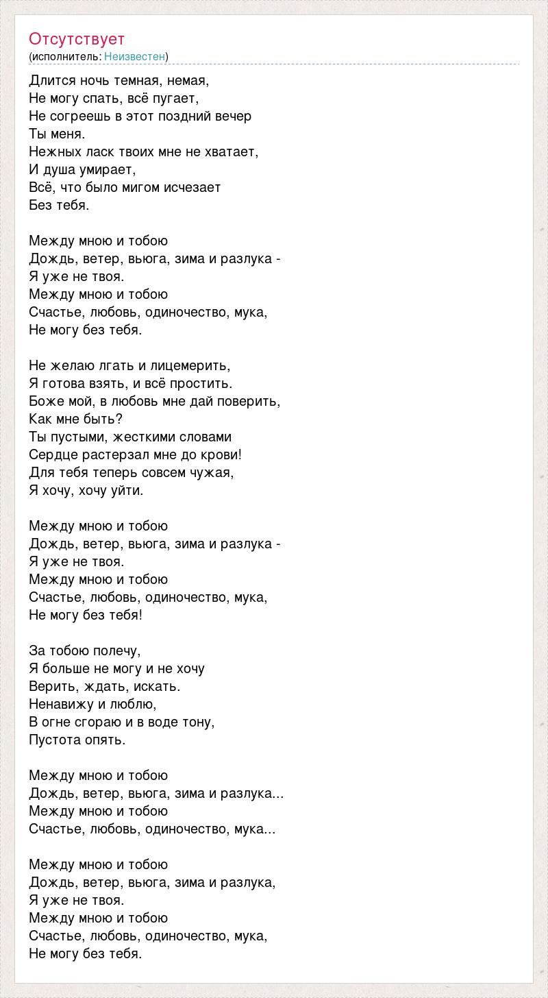 Длится ночь темная, немая, Не могу спать, всё пугает, Не согреешь в этот поздний вечер Ты меня. Нежных ласк твоих мне не хватает, И душа умирает, Всё, что было мигом исчезает Без тебя. Между мною и тобою Дождь, ветер, вьюга, зима и разлука - Я уже не твоя. Между мною и тобою Счастье, любовь, одиночество, мука, Не могу без тебя. Не желаю лгать и лицемерить, Я готова взять, и всё простить. Боже мой, в любовь мне дай поверить, Как мне быть? Ты пустыми, жесткими словами Сердце растерзал мне до крови! Для тебя теперь совсем чужая, Я хочу, хочу уйти. Между мною и тобою Дождь, ветер, вьюга, зима и разлука - Я уже не твоя. Между мною и тобою Счастье, любовь, одиночество, мука, Не могу без тебя! За тобою полечу, Я больше не могу и не хочу Верить, ждать, искать. Ненавижу и люблю, В огне сгораю и в воде тону, Пустота опять. Между мною и тобою Дождь, ветер, вьюга, зима и разлука... Между мною и тобою Счастье, любовь, одиночество, мука... Между мною и тобою Дождь, ветер, вьюга, зима и разлука, Я уже не твоя. Между мною и тобою Счастье, любовь, одиночество, мука, Не могу без тебя.