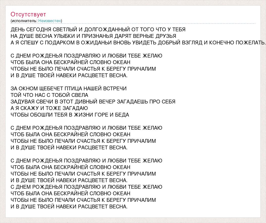 ДЕНЬ СЕГОДНЯ СВЕТЛЫЙ И ДОЛГОЖДАННЫЙ ОТ ТОГО ЧТО У ТЕБЯ НА ДУШЕ ВЕСНА УЛЫБКИ И ПРИЗНАНЬЯ ДАРЯТ ВЕРНЫЕ ДРУЗЬЯ А Я СПЕШУ С ПОДАРКОМ В ОЖИДАНЬИ ВНОВЬ УВИДЕТЬ ДОБРЫЙ ВЗГЛЯД И КОНЕЧНО ПОЖЕЛАТЬ. С ДНЕМ РОЖДЕНЬЯ ПОЗДРАВЛЯЮ И ЛЮБВИ ТЕБЕ ЖЕЛАЮ ЧТОБ БЫЛА ОНА БЕСКРАЙНЕЙ СЛОВНО ОКЕАН ЧТОБЫ НЕ БЫЛО ПЕЧАЛИ СЧАСТЬЯ К БЕРЕГУ ПРИЧАЛИМ И В ДУШЕ ТВОЕЙ НАВЕКИ РАСЦВЕТЕТ ВЕСНА. ЗА ОКНОМ ЩЕБЕЧЕТ ПТИЦА НАШЕЙ ВСТРЕЧИ ТОЙ ЧТО НАС С ТОБОЙ СВЕЛА ЗАДУВАЯ СВЕЧИ В ЭТОТ ДИВНЫЙ ВЕЧЕР ЗАГАДАЕШЬ ПРО СЕБЯ А Я СКАЖУ И ТОЖЕ ЗАГАДАЮ ЧТОБЫ ОБОШЛИ ТЕБЯ В ЖИЗНИ ГОРЕ И БЕДА С ДНЕМ РОЖДЕНЬЯ ПОЗДРАВЛЯЮ И ЛЮБВИ ТЕБЕ ЖЕЛАЮ ЧТОБ БЫЛА ОНА БЕСКРАЙНЕЙ СЛОВНО ОКЕАН ЧТОБЫ НЕ БЫЛО ПЕЧАЛИ СЧАСТЬЯ К БЕРЕГУ ПРИЧАЛИМ И В ДУШЕ ТВОЕЙ НАВЕКИ РАСЦВЕТЕТ ВЕСНА. С ДНЕМ РОЖДЕНЬЯ ПОЗДРАВЛЯЮ И ЛЮБВИ ТЕБЕ ЖЕЛАЮ ЧТОБ БЫЛА ОНА БЕСКРАЙНЕЙ СЛОВНО ОКЕАН ЧТОБЫ НЕ БЫЛО ПЕЧАЛИ СЧАСТЬЯ К БЕРЕГУ ПРИЧАЛИМ И В ДУШЕ ТВОЕЙ НАВЕКИ РАСЦВЕТЕТ ВЕСНА. С ДНЕМ РОЖДЕНЬЯ ПОЗДРАВЛЯЮ И ЛЮБВИ ТЕБЕ ЖЕЛАЮ ЧТОБ БЫЛА ОНА БЕСКРАЙНЕЙ СЛОВНО ОКЕАН ЧТОБЫ НЕ БЫЛО ПЕЧАЛИ СЧАСТЬЯ К БЕРЕГУ ПРИЧАЛИМ И В ДУШЕ ТВОЕЙ НАВЕКИ РАСЦВЕТЕТ ВЕСНА.