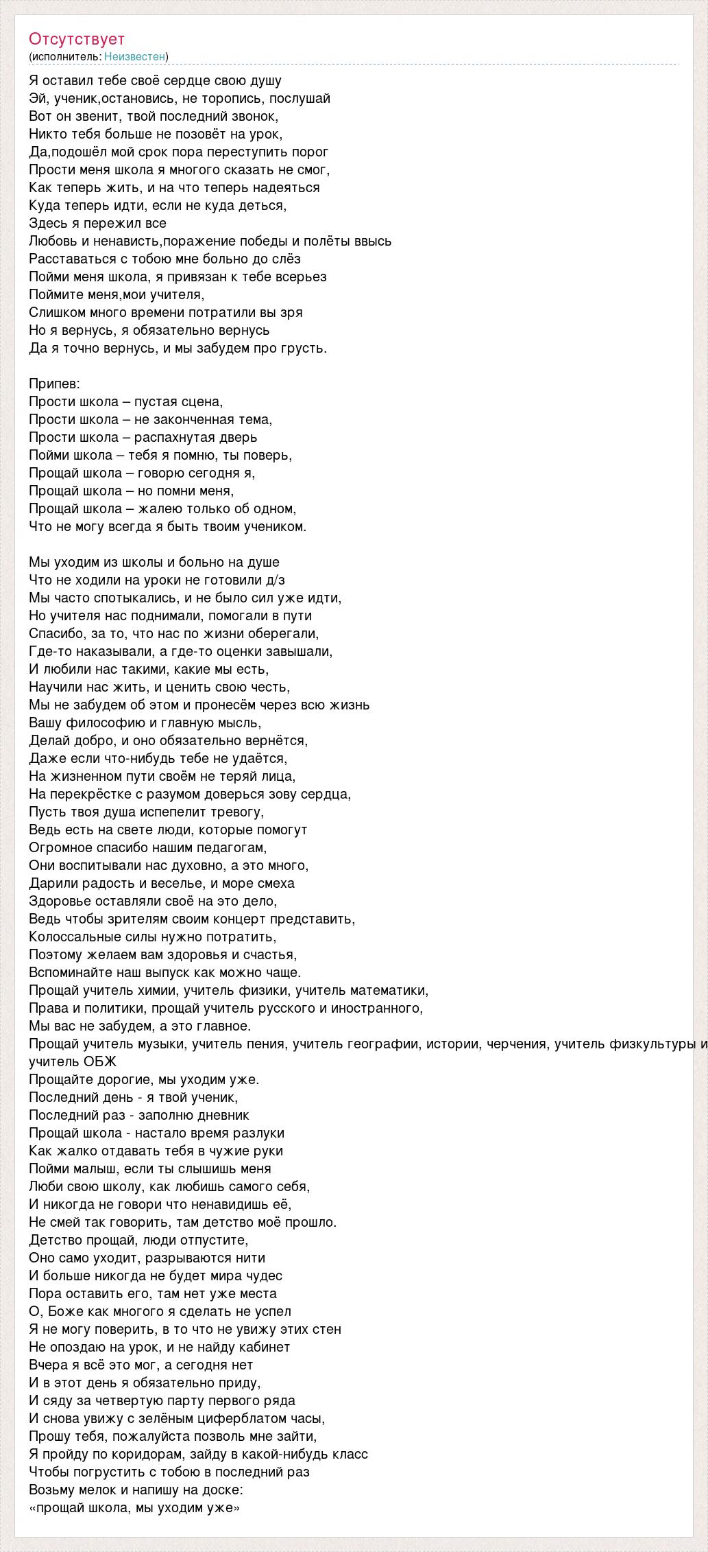 Я оставил тебе своё сердце свою душу Эй, ученик,остановись, не торопись, послушай Вот он звенит, твой последний звонок, Никто тебя больше не позовёт на урок, Да,подошёл мой срок пора переступить порог Прости меня школа я многого сказать не смог, Как теперь жить, и на что теперь надеяться Куда теперь идти, если не куда деться, Здесь я пережил все Любовь и ненависть,поражение победы и полёты ввысь Расставаться с тобою мне больно до слёз Пойми меня школа, я привязан к тебе всерьез Поймите меня,мои учителя, Слишком много времени потратили вы зря Но я вернусь, я обязательно вернусь Да я точно вернусь, и мы забудем про грусть. Припев: Прости школа – пустая сцена, Прости школа – не законченная тема, Прости школа – распахнутая дверь Пойми школа – тебя я помню, ты поверь, Прощай школа – говорю сегодня я, Прощай школа – но помни меня, Прощай школа – жалею только об одном, Что не могу всегда я быть твоим учеником. Мы уходим из школы и больно на душе Что не ходили на уроки не готовили д/з Мы часто спотыкались, и не было сил уже идти, Но учителя нас поднимали, помогали в пути Спасибо, за то, что нас по жизни оберегали, Где-то наказывали, а где-то оценки завышали, И любили нас такими, какие мы есть, Научили нас жить, и ценить свою честь, Мы не забудем об этом и пронесём через всю жизнь Вашу философию и главную мысль, Делай добро, и оно обязательно вернётся, Даже если что-нибудь тебе не удаётся, На жизненном пути своём не теряй лица, На перекрёстке с разумом доверься зову сердца, Пусть твоя душа испепелит тревогу, Ведь есть на свете люди, которые помогут Огромное спасибо нашим педагогам, Они воспитывали нас духовно, а это много, Дарили радость и веселье, и море смеха Здоровье оставляли своё на это дело, Ведь чтобы зрителям своим концерт представить, Колоссальные силы нужно потратить, Поэтому желаем вам здоровья и счастья, Вспоминайте наш выпуск как можно чаще. Прощай учитель химии, учитель физики, учитель математики, Права и политики, прощай учитель русского и иностранного, Мы вас не забудем, а это главное. Прощай учитель музыки, учитель пения, учитель географии, истории, черчения, учитель физкультуры и учитель ОБЖ Прощайте дорогие, мы уходим уже. Последний день - я твой ученик, Последний раз - заполню дневник Прощай школа - настало время разлуки Как жалко отдавать тебя в чужие руки Пойми малыш, если ты слышишь меня Люби свою школу, как любишь самого себя, И никогда не говори что ненавидишь её, Не смей так говорить, там детство моё прошло. Детство прощай, люди отпустите, Оно само уходит, разрываются нити И больше никогда не будет мира чудес Пора оставить его, там нет уже места О, Боже как многого я сделать не успел Я не могу поверить, в то что не увижу этих стен Не опоздаю на урок, и не найду кабинет Вчера я всё это мог, а сегодня нет И в этот день я обязательно приду, И сяду за четвертую парту первого ряда И снова увижу с зелёным циферблатом часы, Прошу тебя, пожалуйста позволь мне зайти, Я пройду по коридорам, зайду в какой-нибудь класс Чтобы погрустить с тобою в последний раз Возьму мелок и напишу на доске: «прощай школа, мы уходим уже»
