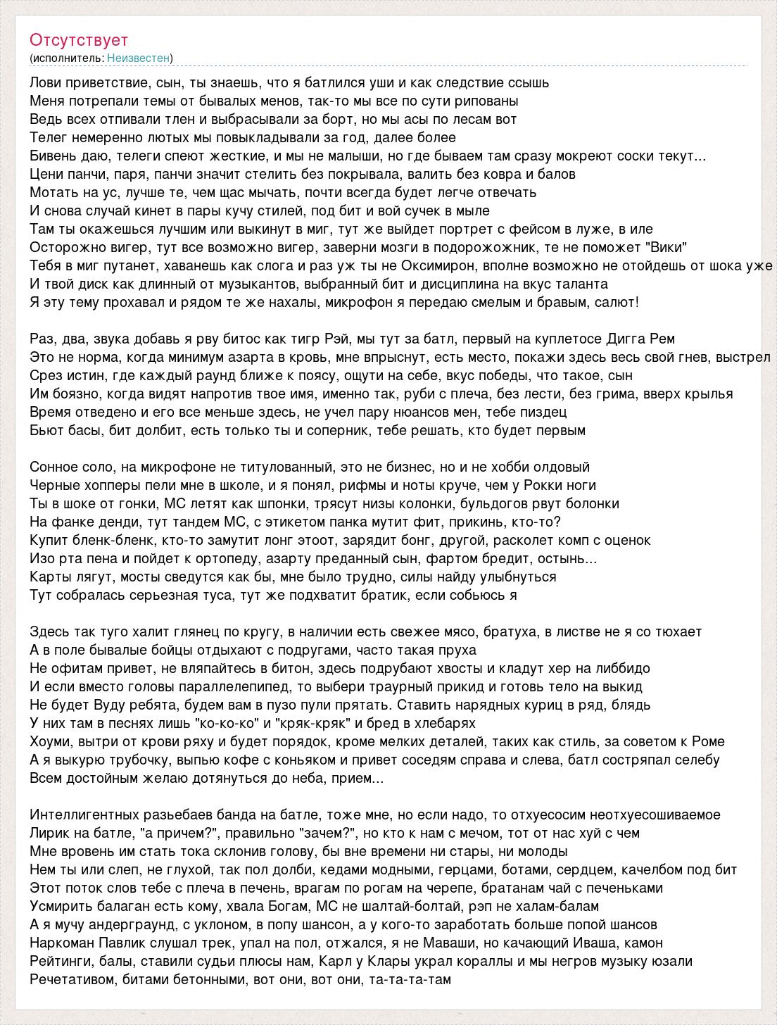 Лови приветствие, сын, ты знаешь, что я батлился уши и как следствие ссышь Меня потрепали темы от бывалых менов, так-то мы все по сути рипованы Ведь всех отпивали тлен и выбрасывали за борт, но мы асы по лесам вот Телег немеренно лютых мы повыкладывали за год, далее более Бивень даю, телеги спеют жесткие, и мы не малыши, но где бываем там сразу мокреют соски текут... Цени панчи, паря, панчи значит стелить без покрывала, валить без ковра и балов Мотать на ус, лучше те, чем щас мычать, почти всегда будет легче отвечать И снова случай кинет в пары кучу стилей, под бит и вой сучек в мыле Там ты окажешься лучшим или выкинут в миг, тут же выйдет портрет с фейсом в луже, в иле Осторожно вигер, тут все возможно вигер, заверни мозги в подорожожник, те не поможет "Вики" Тебя в миг путанет, хаванешь как слога и раз уж ты не Оксимирон, вполне возможно не отойдешь от шока уже И твой диск как длинный от музыкантов, выбранный бит и дисциплина на вкус таланта Я эту тему прохавал и рядом те же нахалы, микрофон я передаю смелым и бравым, салют! Раз, два, звука добавь я рву битос как тигр Рэй, мы тут за батл, первый на куплетосе Дигга Рем Это не норма, когда минимум азарта в кровь, мне впрыснут, есть место, покажи здесь весь свой гнев, выстрел Срез истин, где каждый раунд ближе к поясу, ощути на себе, вкус победы, что такое, сын Им боязно, когда видят напротив твое имя, именно так, руби с плеча, без лести, без грима, вверх крылья Время отведено и его все меньше здесь, не учел пару нюансов мен, тебе пиздец Бьют басы, бит долбит, есть только ты и соперник, тебе решать, кто будет первым Сонное соло, на микрофоне не титулованный, это не бизнес, но и не хобби олдовый Черные хопперы пели мне в школе, и я понял, рифмы и ноты круче, чем у Рокки ноги Ты в шоке от гонки, МС летят как шпонки, трясут низы колонки, бульдогов рвут болонки На фанке денди, тут тандем МС, с этикетом панка мутит фит, прикинь, кто-то? Купит бленк-бленк, кто-то замутит лонг этоот, зарядит бонг, другой, расколет комп с оценок Изо рта пена и пойдет к ортопеду, азарту преданный сын, фартом бредит, остынь... Карты лягут, мосты сведутся как бы, мне было трудно, силы найду улыбнуться Тут собралась серьезная туса, тут же подхватит братик, если собьюсь я Здесь так туго халит глянец по кругу, в наличии есть свежее мясо, братуха, в листве не я со тюхает А в поле бывалые бойцы отдыхают с подругами, часто такая пруха Не офитам привет, не вляпайтесь в битон, здесь подрубают хвосты и кладут хер на либбидо И если вместо головы параллелепипед, то выбери траурный прикид и готовь тело на выкид Не будет Вуду ребята, будем вам в пузо пули прятать. Ставить нарядных куриц в ряд, блядь У них там в песнях лишь "ко-ко-ко" и "кряк-кряк" и бред в хлебарях Хоуми, вытри от крови ряху и будет порядок, кроме мелких деталей, таких как стиль, за советом к Роме А я выкурю трубочку, выпью кофе с коньяком и привет соседям справа и слева, батл состряпал селебу Всем достойным желаю дотянуться до неба, прием... Интеллигентных разьебаев банда на батле, тоже мне, но если надо, то отхуесосим неотхуесошиваемое Лирик на батле, "а причем?", правильно "зачем?", но кто к нам с мечом, тот от нас хуй с чем Мне вровень им стать тока склонив голову, бы вне времени ни стары, ни молоды Нем ты или слеп, не глухой, так пол долби, кедами модными, герцами, ботами, сердцем, качелбом под бит Этот поток слов тебе с пле