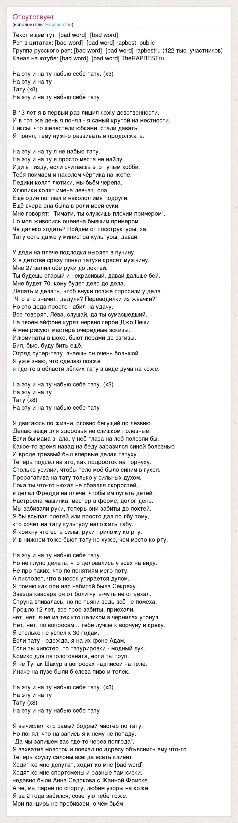 Текст ищем тут: [bad word] [bad word] Рэп в цитатах: [bad word] [bad word] rapbest_public Группа русского рэп: [bad word] [bad word] rapbestru (122 тыс. участников) Канал на ютубе: [bad word] [bad word] TheRAPBESTru На эту и на ту набью себе тату. (х3) На эту и на ту Тату (х8) На эту и на ту набью себе тату В 13 лет я в первый раз лишил кожу девственности. И в тот же день я понял - я самый крутой на местности. Пиксы, что шелестели юбками, стали давать. Я понял, тему нужно развивать и продолжать. На эту и на ту я не набью тату. На эту и на ту я просто места не найду. Иди в пизду, если считаешь это тупым хобби. Тебя поймаем и наколем чёртика на жопе. Педики колят лютики, мы бьём черепа. Хлюпики колят имена девчат, опа. Ещё один поплыл и наколол имя подруги. Ещё вчера она была в роли моей суки. Мне говорят: "Тимати, ты служишь плохим примером". Но моя живопись оценена бывшим примером. Чё далеко ходить? Пойдём от госструктуры, ха. Тату есть даже у министра культуры, давай. У дяди на плече подлодка ныряет в пучину. Я в детстве сразу понял татухи красят мужчину. Мне 27 залил обе руки до локтей. Ты будешь старый и некрасивый, давай дальше бей. Мне будет 70, кому будет дело до дела. Делать и делать, чтоб внуки позже спросили у деда. "Что это значит, дедуля? Переводилки из жвачки?" Но это деда просто набил на удачу. Все говорят, Лёва, слушай, да ты сумасшедший. На твоём айфоне курят нервно герои Джо Пеши. А мне рисуют мастера очередные эскизы. Илюминаты в шоке, бьют перами до эзгизы. Бил, бью, буду бить ещё. Отряд супер-тату, знаешь он очень большой. Я уже знаю, что сделаю позже я где-то в области лёгких тату в виде дума на коже. На эту и на ту набью себе тату. (х3) На эту и на ту Тату (х8) На эту и на ту набью себе тату Я двигаюсь по жизни, словно бегущий по лезвию. Делаю вещи для здоровья не слишком полезные. Если бы мама знала, у неё глаза на лоб полезли бы. Какое-то время назад на беду заразился синей болезнью И вроде трезвый был впервые делая татуху. Теперь подсел на это, как подросток на порнуху. Столько усилий, чтобы тело моё было синим в гухол. Прерагатива на тату только у сильных духом. Пока ты что-то нюхал не сбавляя скоростей, я делал Фредди на плече, чтобы им пугать детей. Настроена машинка, мастер в форме, долог день. Мы забивали руки, теперь они забиты до локтей. Я бы всыпал плетей или просто дал по лбу тому, кто хочет на тату культуру наложить табу. Я крикну что есть силы, руки приложу ко рту. И в нижнем тоже бьют тату не хуже, чем место ко рту. На эту и на ту набью себе тату. Но не глупо делать, что целовались у всех на виду. Не про таких, что по понятиям мего поту. А пистолет, что в носок упирается дулом. Я помню как при нас набитой была Секреху. Звезда квасара он от боли чуть-чуть не отъехал. Струна впивалась, но по пьяни ведь всё не помеха. Прошло 12 лет, все трое забиты, приехали. нет, нет, я не из тех кто целиком в чернилах утонул. Нет, нет, по вопросам... тебе лучше к ворчуну и креку. Я столько не успел к 30 годам. Если тату - одежда, я на их фоне Адам. Если ты хипстер, то татурировки - модный лук. Комикс для патологоаната, если ты труп. Я не Тупак Шакур в вопросах надписей на теле. Иначе на пузе были б слова пиво и телек. На эту и на ту набью себе тату. (х3) На эту и на ту Тату (х8) На эту и на ту набью себе тату Я вычислил кто самый бодрый мастер по тату. Но понял, что на запись я к нему не попаду. "Да мы запишем вас где-то через полгода". Я захватил молоток и поехал по адресу объяснит