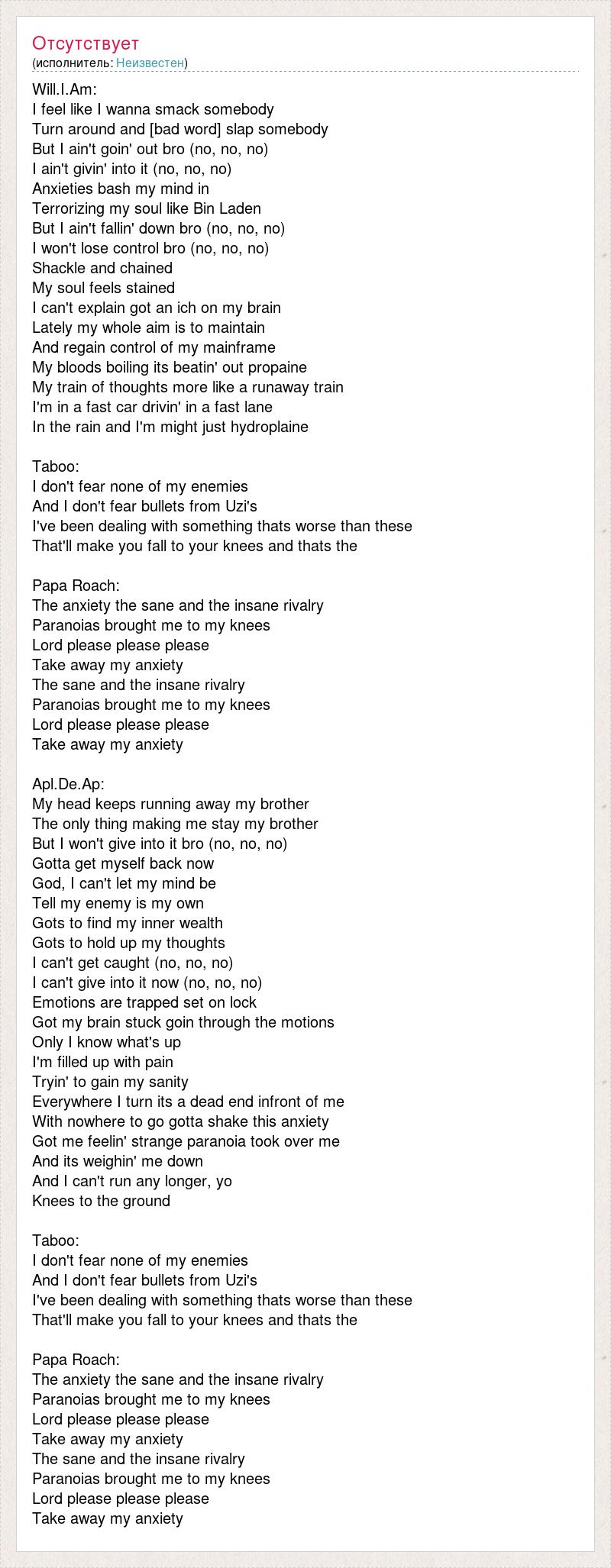 Will.I.Am: I feel like I wanna smack somebody Turn around and [bad word] slap somebody But I ain't goin' out bro (no, no, no) I ain't givin' into it (no, no, no) Anxieties bash my mind in Terrorizing my soul like Bin Laden But I ain't fallin' down bro (no, no, no) I won't lose control bro (no, no, no) Shackle and chained My soul feels stained I can't explain got an ich on my brain Lately my whole aim is to maintain And regain control of my mainframe My bloods boiling its beatin' out propaine My train of thoughts more like a runaway train I'm in a fast car drivin' in a fast lane In the rain and I'm might just hydroplaine Taboo: I don't fear none of my enemies And I don't fear bullets from Uzi's I've been dealing with something thats worse than these That'll make you fall to your knees and thats the Papa Roach: The anxiety the sane and the insane rivalry Paranoias brought me to my knees Lord please please please Take away my anxiety The sane and the insane rivalry Paranoias brought me to my knees Lord please please please Take away my anxiety Apl.De.Ap: My head keeps running away my brother The only thing making me stay my brother But I won't give into it bro (no, no, no) Gotta get myself back now God, I can't let my mind be Tell my enemy is my own Gots to find my inner wealth Gots to hold up my thoughts I can't get caught (no, no, no) I can't give into it now (no, no, no) Emotions are trapped set on lock Got my brain stuck goin through the motions Only I know what's up I'm filled up with pain Tryin' to gain my sanity Everywhere I turn its a dead end infront of me With nowhere to go gotta shake this anxiety Got me feelin' strange paranoia took over me And its weighin' me down And I can't run any longer, yo Knees to the ground Taboo: I don't fear none of my enemies And I don't fear bullets from Uzi's I've been dealing with something thats worse than these That'll make you fall to your knees and thats the Papa Roach: The anxiety the sane and the insane rivalry Paranoias brought me to my knees Lord please please please Take away my anxiety The sane and the insane rivalry Paranoias brought me to my knees Lord please please please Take away my anxiety