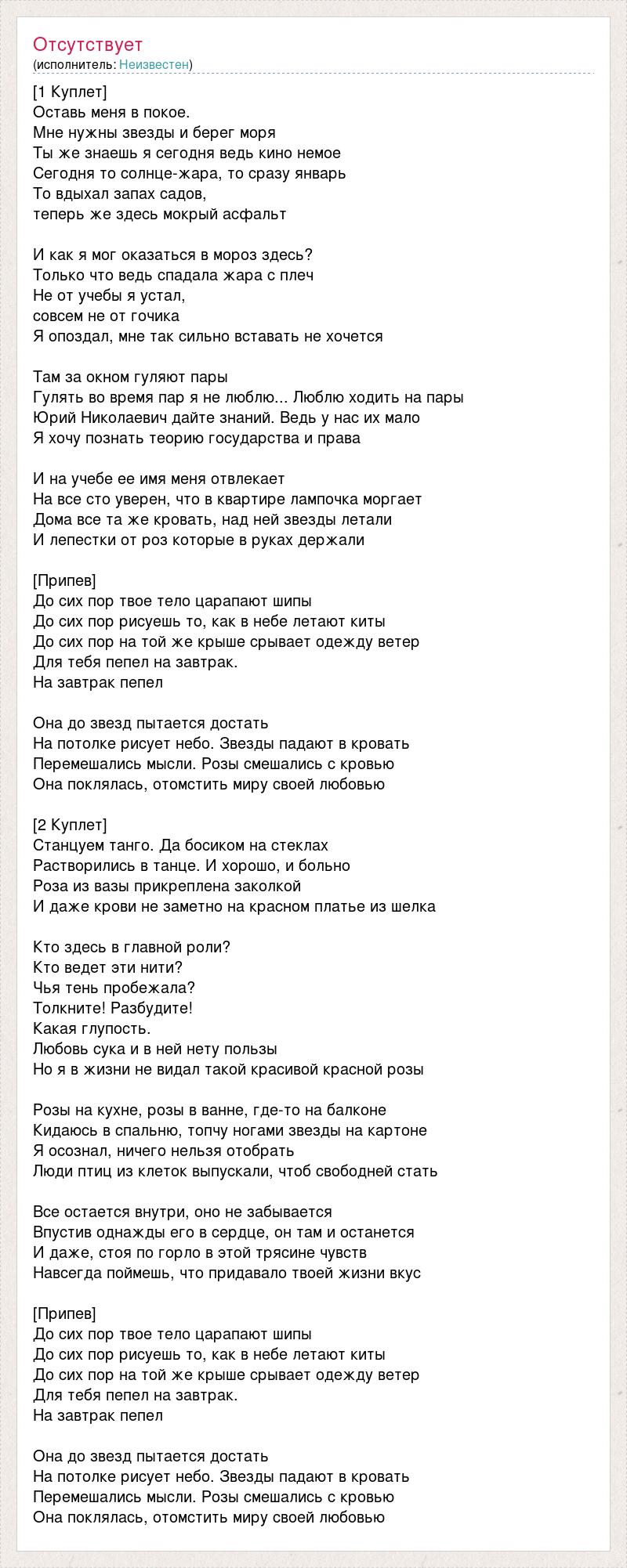 [1 Куплет] Оставь меня в покое. Мне нужны звезды и берег моря Ты же знаешь я сегодня ведь кино немое Сегодня то солнце-жара, то сразу январь То вдыхал запах садов, теперь же здесь мокрый асфальт И как я мог оказаться в мороз здесь? Только что ведь спадала жара с плеч Не от учебы я устал, совсем не от гочика Я опоздал, мне так сильно вставать не хочется Там за окном гуляют пары Гулять во время пар я не люблю... Люблю ходить на пары Юрий Николаевич дайте знаний. Ведь у нас их мало Я хочу познать теорию государства и права И на учебе ее имя меня отвлекает На все сто уверен, что в квартире лампочка моргает Дома все та же кровать, над ней звезды летали И лепестки от роз которые в руках держали [Припев] До сих пор твое тело царапают шипы До сих пор рисуешь то, как в небе летают киты До сих пор на той же крыше срывает одежду ветер Для тебя пепел на завтрак. На завтрак пепел Она до звезд пытается достать На потолке рисует небо. Звезды падают в кровать Перемешались мысли. Розы смешались с кровью Она поклялась, отомстить миру своей любовью [2 Куплет] Станцуем танго. Да босиком на стеклах Растворились в танце. И хорошо, и больно Роза из вазы прикреплена заколкой И даже крови не заметно на красном платье из шелка Кто здесь в главной роли? Кто ведет эти нити? Чья тень пробежала? Толкните! Разбудите! Какая глупость. Любовь сука и в ней нету пользы Но я в жизни не видал такой красивой красной розы Розы на кухне, розы в ванне, где-то на балконе Кидаюсь в спальню, топчу ногами звезды на картоне Я осознал, ничего нельзя отобрать Люди птиц из клеток выпускали, чтоб свободней стать Все остается внутри, оно не забывается Впустив однажды его в сердце, он там и останется И даже, стоя по горло в этой трясине чувств Навсегда поймешь, что придавало твоей жизни вкус [Припев] До сих пор твое тело царапают шипы До сих пор рисуешь то, как в небе летают киты До сих пор на той же крыше срывает одежду ветер Для тебя пепел на завтрак. На завтрак пепел Она до звезд пытается достать На потолке рисует небо. Звезды падают в кровать Перемешались мысли. Розы смешались с кровью Она поклялась, отомстить миру своей любовью
