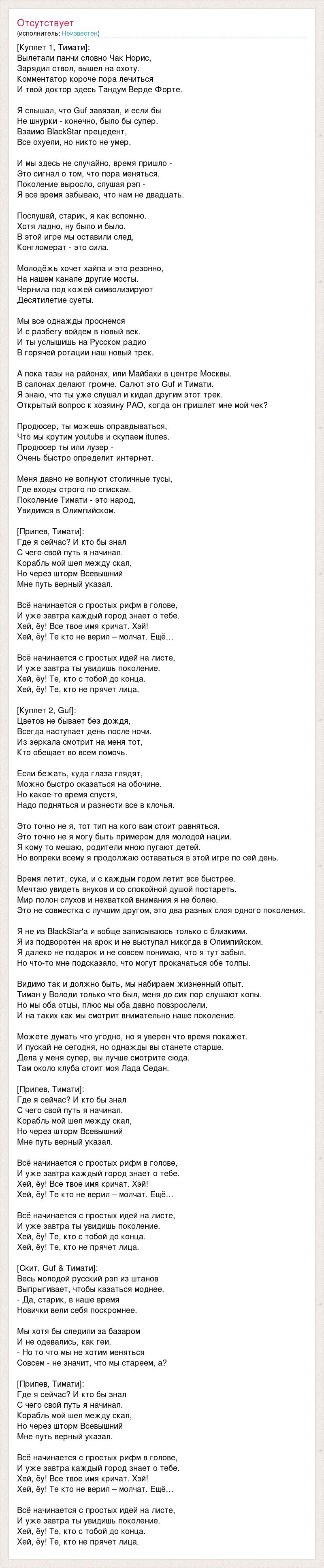 [Куплет 1, Тимати]: Вылетали панчи словно Чак Норис, Зарядил ствол, вышел на охоту. Комментатор короче пора лечиться И твой доктор здесь Тандум Верде Форте. Я слышал, что Guf завязал, и если бы Не шнурки - конечно, было бы супер. Взаимо BlackStar прецедент, Все охуели, но никто не умер. И мы здесь не случайно, время пришло - Это сигнал о том, что пора меняться. Поколение выросло, слушая рэп - Я все время забываю, что нам не двадцать. Послушай, старик, я как вспомню. Хотя ладно, ну было и было. В этой игре мы оставили след, Конгломерат - это сила. Молодёжь хочет хайпа и это резонно, На нашем канале другие мосты. Чернила под кожей символизируют Десятилетие суеты. Мы все однажды проснемся И с разбегу войдем в новый век. И ты услышишь на Русском радио В горячей ротации наш новый трек. А пока тазы на районах, или Майбахи в центре Москвы. В салонах делают громче. Салют это Guf и Тимати. Я знаю, что ты уже слушал и кидал другим этот трек. Открытый вопрос к хозяину РАО, когда он пришлет мне мой чек? Продюсер, ты можешь оправдываться, Что мы крутим youtube и скупаем itunes. Продюсер ты или лузер - Очень быстро определит интернет. Меня давно не волнуют столичные тусы, Где входы строго по спискам. Поколение Тимати - это народ, Увидимся в Олимпийском. [Припев, Тимати]: Где я сейчас? И кто бы знал С чего свой путь я начинал. Корабль мой шел между скал, Но через шторм Всевышний Мне путь верный указал. Всё начинается с простых рифм в голове, И уже завтра каждый город знает о тебе. Хей, ёу! Все твое имя кричат. Хэй! Хей, ёу! Те кто не верил – молчат. Ещё… Всё начинается с простых идей на листе, И уже завтра ты увидишь поколение. Хей, ёу! Те, кто с тобой до конца. Хей, ёу! Те, кто не прячет лица. [Куплет 2, Guf]: Цветов не бывает без дождя, Всегда наступает день после ночи. Из зеркала смотрит на меня тот, Кто обещает во всем помочь. Если бежать, куда глаза глядят, Можно быстро оказаться на обочине. Но какое-то время спустя, Надо подняться и разнести все в клочья. Это точно не я, тот тип на кого вам стоит равняться. Это точно не я могу быть примером для молодой нации. Я кому то мешаю, родители мною пугают детей. Но вопреки всему я продолжаю оставаться в этой игре по сей день. Время летит, сука, и с каждым годом летит все быстрее. Мечтаю увидеть внуков и со спокойной душой постареть. Мир полон слухов и нехваткой внимания я не болею. Это не совместка с лучшим другом, это два разных слоя одного поколения. Я не из BlackStar'а и вобще записываюсь только с близкими. Я из подворотен на арок и не выступал никогда в Олимпийском. Я далеко не подарок и не совсем понимаю, что я тут забыл. Но что-то мне подсказало, что могут прокачаться обе толпы. Видимо так и должно быть, мы набираем жизненный опыт. Тиман у Володи только что был, меня до сих пор слушают копы. Но мы оба отцы, плюс мы оба давно повзрослели. И на таких как мы смотрит внимательно наше поколение. Можете думать что угодно, но я уверен что время покажет. И пускай не сегодня, но однажды вы станете старше. Дела у меня супер, вы лучше смотрите сюда. Там около клуба стоит моя Лада Седан. [Припев, Тимати]: Где я сейчас? И кто бы знал С чего свой путь я начинал. Корабль мой шел между скал, Но через шторм Всевышний Мне путь верный указал. Всё начинается с простых рифм в голове, И уже завтра каждый город знает о тебе. Хей, ёу! Все твое имя кричат. Хэй! Хей, ёу! Те кто не верил – молчат. Ещё… Всё начинается с про