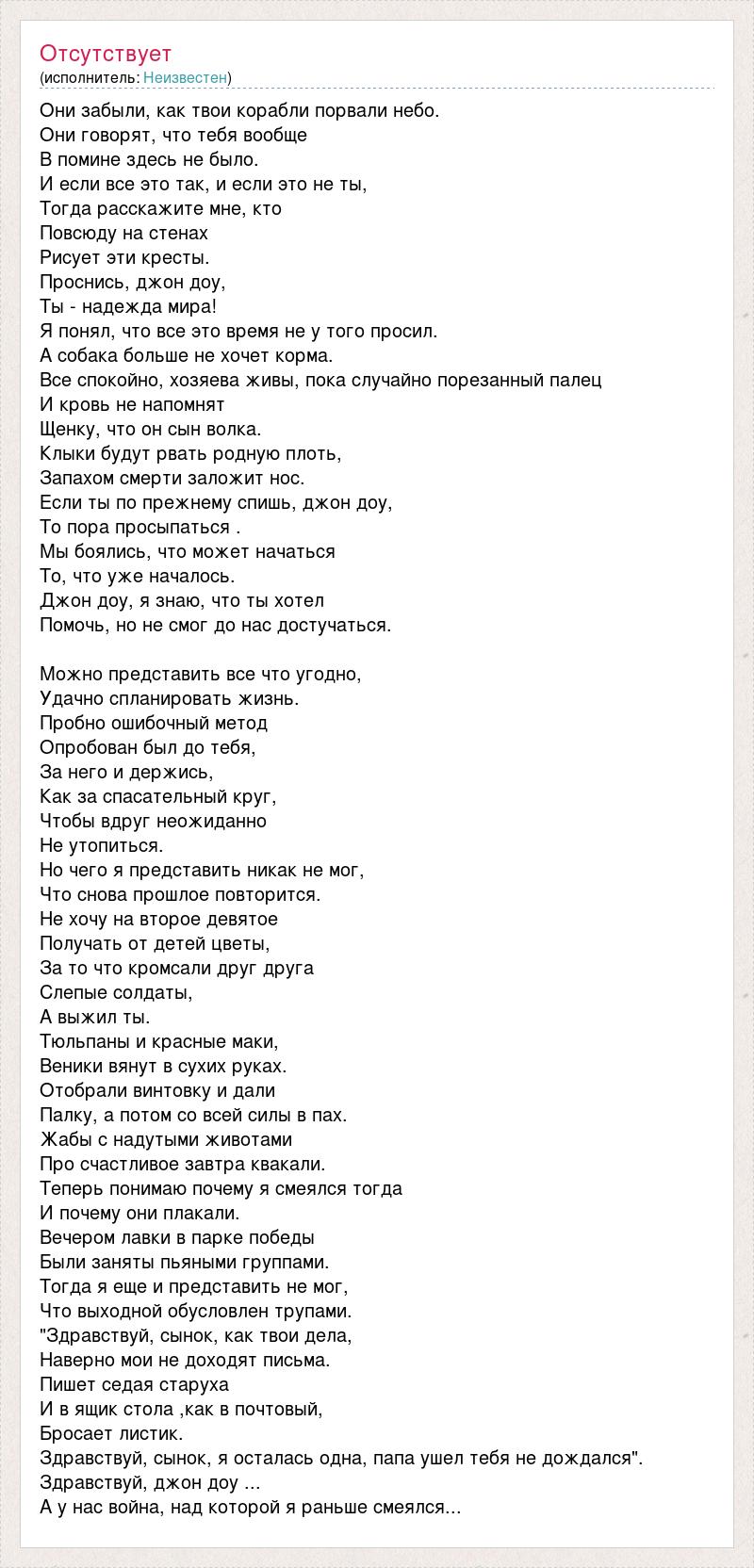 Они забыли, как твои корабли порвали небо. Они говорят, что тебя вообще В помине здесь не было. И если все это так, и если это не ты, Тогда расскажите мне, кто Повсюду на стенах Рисует эти кресты. Проснись, джон доу, Ты - надежда мира! Я понял, что все это время не у того просил. А собака больше не хочет корма. Все спокойно, хозяева живы, пока случайно порезанный палец И кровь не напомнят Щенку, что он сын волка. Клыки будут рвать родную плоть, Запахом смерти заложит нос. Если ты по прежнему спишь, джон доу, То пора просыпаться . Мы боялись, что может начаться То, что уже началось. Джон доу, я знаю, что ты хотел Помочь, но не смог до нас достучаться. Можно представить все что угодно, Удачно спланировать жизнь. Пробно ошибочный метод Опробован был до тебя, За него и держись, Как за спасательный круг, Чтобы вдруг неожиданно Не утопиться. Но чего я представить никак не мог, Что снова прошлое повторится. Не хочу на второе девятое Получать от детей цветы, За то что кромсали друг друга Слепые солдаты, А выжил ты. Тюльпаны и красные маки, Веники вянут в сухих руках. Отобрали винтовку и дали Палку, а потом со всей силы в пах. Жабы с надутыми животами Про счастливое завтра квакали. Теперь понимаю почему я смеялся тогда И почему они плакали. Вечером лавки в парке победы Были заняты пьяными группами. Тогда я еще и представить не мог, Что выходной обусловлен трупами. "Здравствуй, сынок, как твои дела, Наверно мои не доходят письма. Пишет седая старуха И в ящик стола ,как в почтовый, Бросает листик. Здравствуй, сынок, я осталась одна, папа ушел тебя не дождался". Здравствуй, джон доу ... А у нас война, над которой я раньше смеялся...