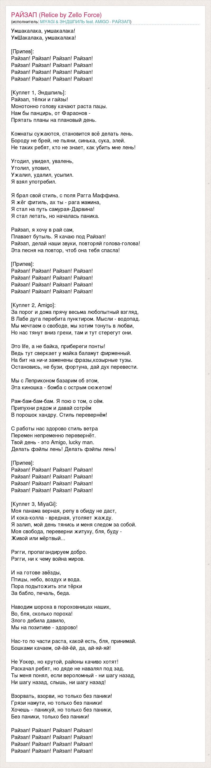 Умшакалака, умшакалака! УмШакалака, умшакалака! [Припев]: Райзап! Райзап! Райзап! Райзап! Райзап! Райзап! Райзап! Райзап! Райзап! Райзап! Райзап! Райзап! Райзап! Райзап! Райзап! Райзап! [Куплет 1, Эндшпиль]: Райзап, тёлки и гайзы! Монотонно голову качают раста пацы. Нам бы панцирь, от Фараонов - Прятать планы на плановый день. Комнаты сужаются, становится всё делать лень. Бороду не брей, не пьяни, синька, сука, злей. Не таких ребят, кто не знает, как убить мне лень! Угодил, увидел, увалень, Утолил, уловил, Ужалил, удалил, усыпил. Я взял употребил. Я брал свой стиль, с поля Рагга Маффина. Я жёг фитиль, ах ты - рага мамина, Я стал на путь самурая-Дарвина! Я стал летать, но началась паника. Райзап, я хочу в рай сам, Плавает бутыль. Я качаю под Райзап! Райзап, делай наши звуки, повторяй голова-голова! Эта песня на повтор, чтоб она тебя спасла! [Припев]: Райзап! Райзап! Райзап! Райзап! Райзап! Райзап! Райзап! Райзап! Райзап! Райзап! Райзап! Райзап! Райзап! Райзап! Райзап! Райзап! [Куплет 2, Amigo]: За порог и дома прячу весьма любопытный взгляд, В Лабе дуга перебита пунктиром. Мысли - водопад. Мы мечтаем о свободе, мы хотим тонуть в любви, Но нас тянут вниз грехи, там и тут стерегут они. Это life, а не байка, прибереги понты! Ведь тут сверкает у майка баламут фирменный. На бит на ни-и заменены фразы,козырные тузы. Остановись, не бузи, фортуна, дай дух перевести. Мы с Леприконом базарим об этом, Эта киношка - бомба с острым сюжетом! Рам-бам-бам-бам. Я пою о том, о сём. Припухни рядом и давай сотрём В порошок хандру. Стиль перевернём! С работы нас здорово стиль ветра Перемен непременно перевернёт. Твой день - это Amigo, lucky man. Делать фэйлы лень! Делать фэйлы лень! [Припев]: Райзап! Райзап! Райзап! Райзап! Райзап! Райзап! Райзап! Райзап! Райзап! Райзап! Райзап! Райзап! Райзап! Райзап! Райзап! Райзап! [Куплет 3, MiyaGi]: Моя панама верная, репу в обиду не даст, И кока-колла - вредная, утоляет жажду. Я залип, мой день тянись и меня следом за собой. Моя свобода, переверни житуху, бля, буду - Живой или мёртвый... Рэгги, пропагандируем добро. Рэгги, ни к чему война миров. И на готове звёзды, Птицы, небо, воздух и вода. Пора подытожить эти тёрки За бабло, печаль, беда. Наводим шороха в пороховницах наших, Во, бля, сколько пороха! Злого дебила давило, Мы на позитиве - здорово! Нас-то по части раста, какой есть, бля, принимай. Бошками качаем, ой-ёй-ёй, да, ай-яй-яй! Не Уокер, но крутой, районы качиво хотят! Раскачал ребят, но дяде не навалял под зад. Ты меня понял, если вероломный - ни шагу назад, Ни шагу назад, слышь, ни шагу назад! Взорвать, взорви, но только без паники! Грязи намути, но только без паники! Хочешь - паникуй, но только без паники, Без паники, только без паники! Райзап! Райзап! Райзап! Райзап! Райзап! Райзап! Райзап! Райзап! Райзап! Райзап! Райзап! Райзап! Райзап! Райзап! Райзап! Райзап!
