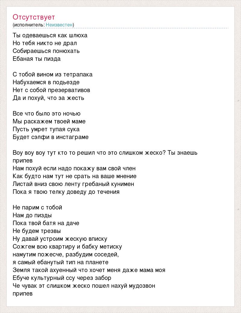 Ты одеваешься как шлюха Но тебя никто не драл Собираешься понюхать Ебаная ты пизда С тобой вином из тетрапака Набухаемся в подьезде Нет с собой презервативов Да и похуй, что за жесть Все что было это ночью Мы раскажем твоей маме Пусть умрет тупая сука Будет сэлфи в инстаграме Воу воу воу тут кто то решил что это слишком жеско? Ты знаешь припев Нам похуй если надо покажу вам свой член Как будто нам тут не срать на ваше мнение Листай вниз свою ленту гребаный кунимен Пока я твою телку доведу до течения Не парим с тобой Нам до пизды Пока твой батя на даче Не будем трезвы Ну давай устроим жескую вписку Сожгем всю квартиру и бабку метиску намутим пожесче, разбудим соседей, я самый ебанутый тип на планете Земля такой ахуенный что хочет меня даже мама моя Ебуче культурный ссу через забор Че чувак эт слишком жеско пошел нахуй мудозвон припев