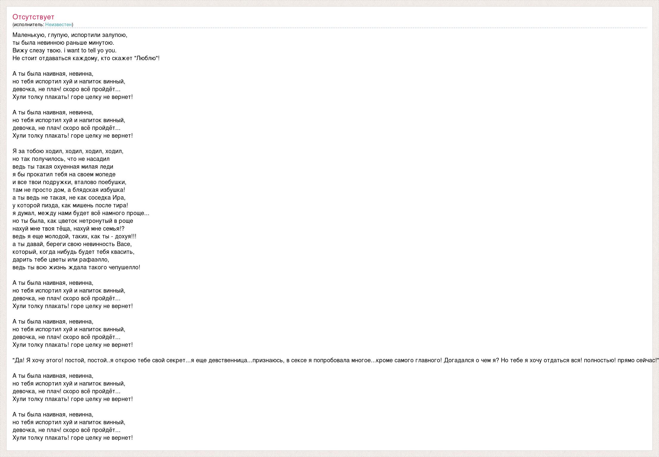 Маленькую, глупую, испортили залупою, ты была невинною раньше минутою. Вижу слезу твою. i want to tell yo you. Не стоит отдаваться каждому, кто скажет "Люблю"! А ты была наивная, невинна, но тебя испортил хуй и напиток винный, девочка, не плач! скоро всё пройдёт... Хули толку плакать! горе целку не вернет! А ты была наивная, невинна, но тебя испортил хуй и напиток винный, девочка, не плач! скоро всё пройдёт... Хули толку плакать! горе целку не вернет! Я за тобою ходил, ходил, ходил, ходил, но так получилось, что не насадил ведь ты такая охуенная милая леди я бы прокатил тебя на своем мопеде и все твои подружки, вталово поебушки, там не просто дом, а блядская избушка! а ты ведь не такая, не как соседка Ира, у которой пизда, как мишень после тира! я думал, между нами будет всё намного проще... но ты была, как цветок нетронутый в роще нахуй мне твоя тёща, нахуй мне семья!? ведь я еще молодой, таких, как ты - дохуя!!! а ты давай, береги свою невинность Васе, который, когда нибудь будет тебя квасить, дарить тебе цветы или рафаэлло, ведь ты всю жизнь ждала такого чепушелло! А ты была наивная, невинна, но тебя испортил хуй и напиток винный, девочка, не плач! скоро всё пройдёт... Хули толку плакать! горе целку не вернет! А ты была наивная, невинна, но тебя испортил хуй и напиток винный, девочка, не плач! скоро всё пройдёт... Хули толку плакать! горе целку не вернет! "Да! Я хочу этого! постой, постой..я открою тебе свой секрет...я еще девственница...признаюсь, в сексе я попробовала многое...кроме самого главного! Догадался о чем я? Но тебе я хочу отдаться вся! полностью! прямо сейчас!" А ты была наивная, невинна, но тебя испортил хуй и напиток винный, девочка, не плач! скоро всё пройдёт... Хули толку плакать! горе целку не вернет! А ты была наивная, невинна, но тебя испортил хуй и напиток винный, девочка, не плач! скоро всё пройдёт... Хули толку плакать! горе целку не вернет!