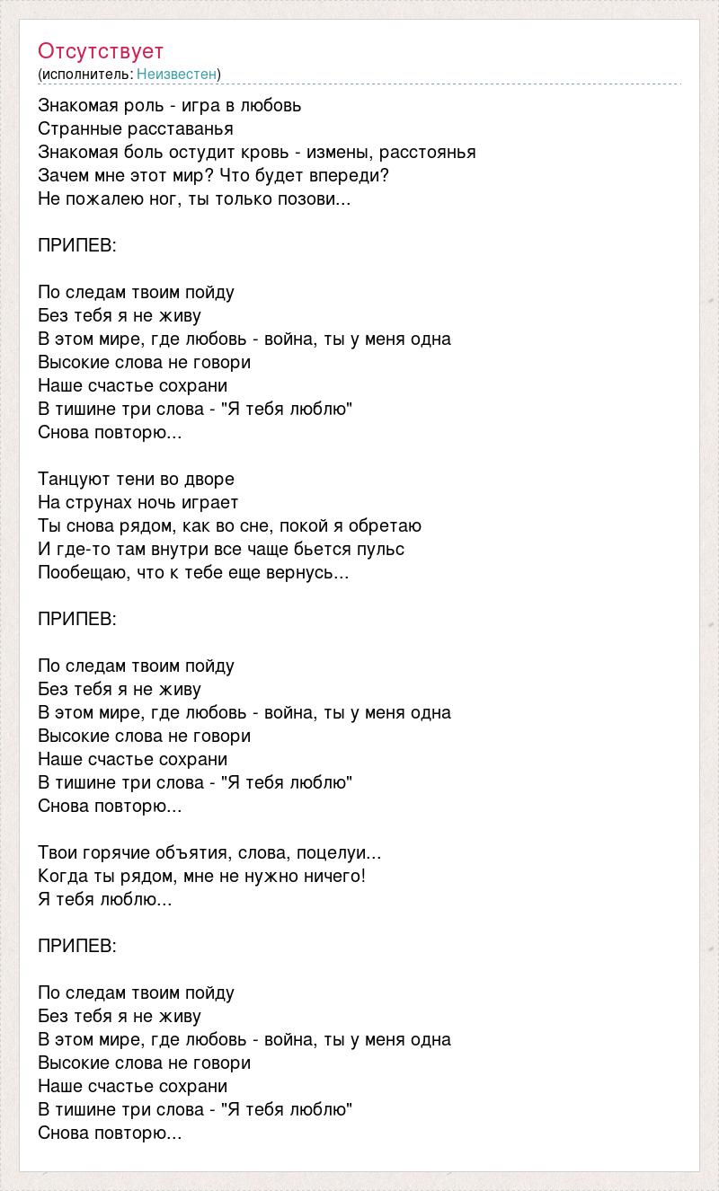 Знакомая роль - игра в любовь Странные расставанья Знакомая боль остудит кровь - измены, расстоянья Зачем мне этот мир? Что будет впереди? Не пожалею ног, ты только позови... ПРИПЕВ: По следам твоим пойду Без тебя я не живу В этом мире, где любовь - война, ты у меня одна Высокие слова не говори Наше счастье сохрани В тишине три слова - "Я тебя люблю" Снова повторю... Танцуют тени во дворе На струнах ночь играет Ты снова рядом, как во сне, покой я обретаю И где-то там внутри все чаще бьется пульс Пообещаю, что к тебе еще вернусь... ПРИПЕВ: По следам твоим пойду Без тебя я не живу В этом мире, где любовь - война, ты у меня одна Высокие слова не говори Наше счастье сохрани В тишине три слова - "Я тебя люблю" Снова повторю... Твои горячие объятия, слова, поцелуи... Когда ты рядом, мне не нужно ничего! Я тебя люблю... ПРИПЕВ: По следам твоим пойду Без тебя я не живу В этом мире, где любовь - война, ты у меня одна Высокие слова не говори Наше счастье сохрани В тишине три слова - "Я тебя люблю" Снова повторю...