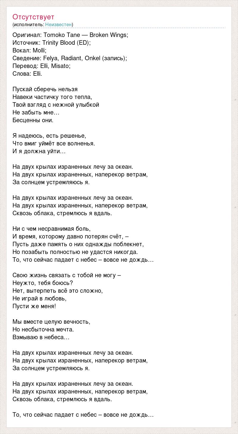 Оригинал: Tomoko Tane — Broken Wings; Источник: Trinity Blood (ED); Вокал: Molli; Сведение: Felya, Radiant, Onkel (запись); Перевод: Elli, Misato; Слова: Elli. Пускай сберечь нельзя Навеки частичку того тепла, Твой взгляд с нежной улыбкой Не забыть мне… Бесценны они. Я надеюсь, есть решенье, Что вмиг уймёт все волненья. И я должна уйти… На двух крылах израненных лечу за океан. На двух крылах израненных, наперекор ветрам, За солнцем устремляюсь я. На двух крылах израненных лечу за океан. На двух крылах израненных, наперекор ветрам, Сквозь облака, стремлюсь я вдаль. Ни с чем несравнимая боль, И время, которому давно потерян счёт, – Пусть даже память о них однажды поблекнет, Но позабыть полностью не удастся никогда. То, что сейчас падает с небес – вовсе не дождь… Свою жизнь связать с тобой не могу – Неужто, тебя боюсь? Нет, вытерпеть всё это сложно, Не играй в любовь, Пусти же меня! Мы вместе целую вечность, Но несбыточна мечта. Взмываю в небеса… На двух крылах израненных лечу за океан. На двух крылах израненных, наперекор ветрам, За солнцем устремляюсь я. На двух крылах израненных лечу за океан. На двух крылах израненных, наперекор ветрам, Сквозь облака, стремлюсь я вдаль. То, что сейчас падает с небес – вовсе не дождь…