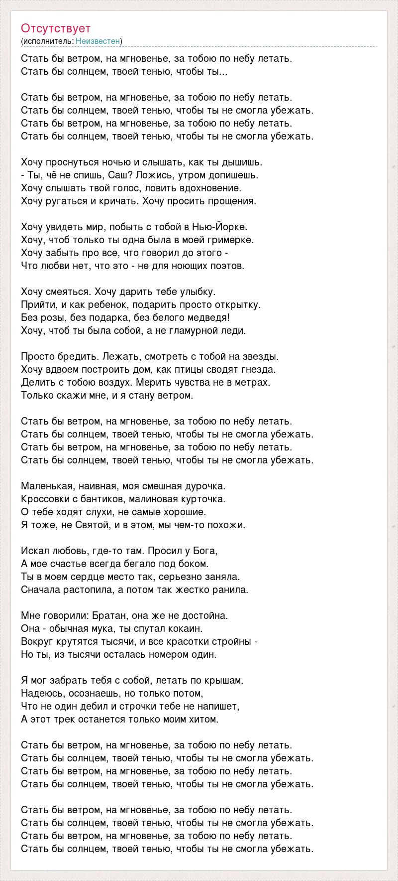 Стать бы ветром, на мгновенье, за тобою по небу летать. Стать бы солнцем, твоей тенью, чтобы ты... Стать бы ветром, на мгновенье, за тобою по небу летать. Стать бы солнцем, твоей тенью, чтобы ты не смогла убежать. Стать бы ветром, на мгновенье, за тобою по небу летать. Стать бы солнцем, твоей тенью, чтобы ты не смогла убежать. Хочу проснуться ночью и слышать, как ты дышишь. - Ты, чё не спишь, Саш? Ложись, утром допишешь. Хочу слышать твой голос, ловить вдохновение. Хочу ругаться и кричать. Хочу просить прощения. Хочу увидеть мир, побыть с тобой в Нью-Йорке. Хочу, чтоб только ты одна была в моей гримерке. Хочу забыть про все, что говорил до этого - Что любви нет, что это - не для ноющих поэтов. Хочу смеяться. Хочу дарить тебе улыбку. Прийти, и как ребенок, подарить просто открытку. Без розы, без подарка, без белого медведя! Хочу, чтоб ты была собой, а не гламурной леди. Просто бредить. Лежать, смотреть с тобой на звезды. Хочу вдвоем построить дом, как птицы сводят гнезда. Делить с тобою воздух. Мерить чувства не в метрах. Только скажи мне, и я стану ветром. Стать бы ветром, на мгновенье, за тобою по небу летать. Стать бы солнцем, твоей тенью, чтобы ты не смогла убежать. Стать бы ветром, на мгновенье, за тобою по небу летать. Стать бы солнцем, твоей тенью, чтобы ты не смогла убежать. Маленькая, наивная, моя смешная дурочка. Кроссовки с бантиков, малиновая курточка. О тебе ходят слухи, не самые хорошие. Я тоже, не Святой, и в этом, мы чем-то похожи. Искал любовь, где-то там. Просил у Бога, А мое счастье всегда бегало под боком. Ты в моем сердце место так, серьезно заняла. Сначала растопила, а потом так жестко ранила. Мне говорили: Братан, она же не достойна. Она - обычная мука, ты спутал кокаин. Вокруг крутятся тысячи, и все красотки стройны - Но ты, из тысячи осталась номером один. Я мог забрать тебя с собой, летать по крышам. Надеюсь, осознаешь, но только потом, Что не один дебил и строчки тебе не напишет, А этот трек останется только моим хитом. Стать бы ветром, на мгновенье, за тобою по небу летать. Стать бы солнцем, твоей тенью, чтобы ты не смогла убежать. Стать бы ветром, на мгновенье, за тобою по небу летать. Стать бы солнцем, твоей тенью, чтобы ты не смогла убежать. Стать бы ветром, на мгновенье, за тобою по небу летать. Стать бы солнцем, твоей тенью, чтобы ты не смогла убежать. Стать бы ветром, на мгновенье, за тобою по небу летать. Стать бы солнцем, твоей тенью, чтобы ты не смогла убежать.