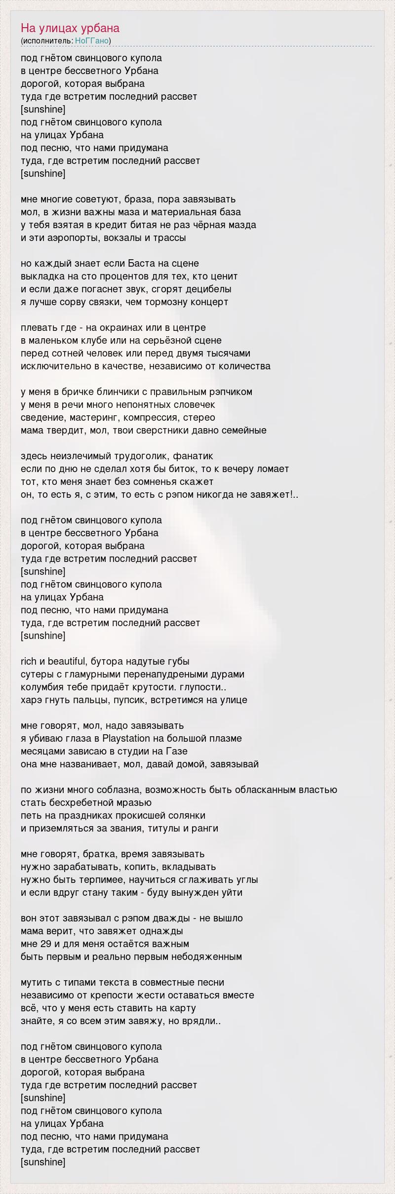под гнётом свинцового купола в центре бессветного Урбана дорогой, которая выбрана туда где встретим последний рассвет [sunshine] под гнётом свинцового купола на улицах Урбана под песню, что нами придумана туда, где встретим последний рассвет [sunshine] мне многие советуют, браза, пора завязывать мол, в жизни важны маза и материальная база у тебя взятая в кредит битая не раз чёрная мазда и эти аэропорты, вокзалы и трассы но каждый знает если Баста на сцене выкладка на сто процентов для тех, кто ценит и если даже погаснет звук, сгорят децибелы я лучше сорву связки, чем тормозну концерт плевать где - на окраинах или в центре в маленьком клубе или на серьёзной сцене перед сотней человек или перед двумя тысячами исключительно в качестве, независимо от количества у меня в бричке блинчики с правильным рэпчиком у меня в речи много непонятных словечек сведение, мастеринг, компрессия, стерео мама твердит, мол, твои сверстники давно семейные здесь неизлечимый трудоголик, фанатик если по дню не сделал хотя бы биток, то к вечеру ломает тот, кто меня знает без сомненья скажет он, то есть я, с этим, то есть с рэпом никогда не завяжет!.. под гнётом свинцового купола в центре бессветного Урбана дорогой, которая выбрана туда где встретим последний рассвет [sunshine] под гнётом свинцового купола на улицах Урбана под песню, что нами придумана туда, где встретим последний рассвет [sunshine] rich и beautiful, бутора надутые губы сутеры с гламурными перенапудреными дурами колумбия тебе придаёт крутости. глупости.. харэ гнуть пальцы, пупсик, встретимся на улице мне говорят, мол, надо завязывать я убиваю глаза в Playstation на большой плазме месяцами зависаю в студии на Газе она мне названивает, мол, давай домой, завязывай по жизни много соблазна, возможность быть обласканным властью стать бесхребетной мразью петь на праздниках прокисшей солянки и приземляться за звания, титулы и ранги мне говорят, братка, время завязывать нужно зарабатывать, копить, вкладывать нужно быть терпимее, научиться сглаживать углы и если вдруг стану таким - буду вынужден уйти вон этот завязывал с рэпом дважды - не вышло мама верит, что завяжет однажды мне 29 и для меня остаётся важным быть первым и реально первым небодяженным мутить с типами текста в совместные песни независимо от крепости жести оставаться вместе всё, что у меня есть ставить на карту знайте, я со всем этим завяжу, но врядли.. под гнётом свинцового купола в центре бессветного Урбана дорогой, которая выбрана туда где встретим последний рассвет [sunshine] под гнётом свинцового купола на улицах Урбана под песню, что нами придумана туда, где встретим последний рассвет [sunshine]