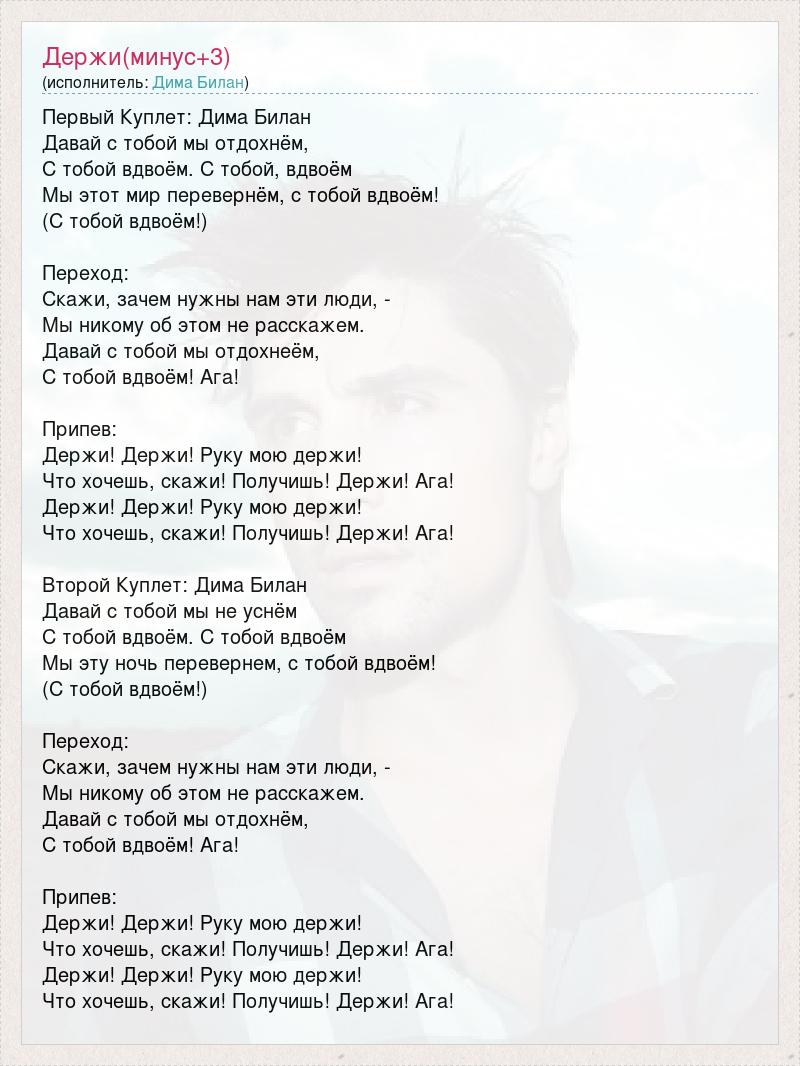 Первый Куплет: Дима Билан Давай с тобой мы отдохнём, С тобой вдвоём. С тобой, вдвоём Мы этот мир перевернём, с тобой вдвоём! (С тобой вдвоём!) Переход: Скажи, зачем нужны нам эти люди, - Мы никому об этом не расскажем. Давай с тобой мы отдохнеём, С тобой вдвоём! Ага! Припев: Держи! Держи! Руку мою держи! Что хочешь, скажи! Получишь! Держи! Ага! Держи! Держи! Руку мою держи! Что хочешь, скажи! Получишь! Держи! Ага! Второй Куплет: Дима Билан Давай с тобой мы не уснём С тобой вдвоём. С тобой вдвоём Мы эту ночь перевернем, с тобой вдвоём! (С тобой вдвоём!) Переход: Скажи, зачем нужны нам эти люди, - Мы никому об этом не расскажем. Давай с тобой мы отдохнём, С тобой вдвоём! Ага! Припев: Держи! Держи! Руку мою держи! Что хочешь, скажи! Получишь! Держи! Ага! Держи! Держи! Руку мою держи! Что хочешь, скажи! Получишь! Держи! Ага!