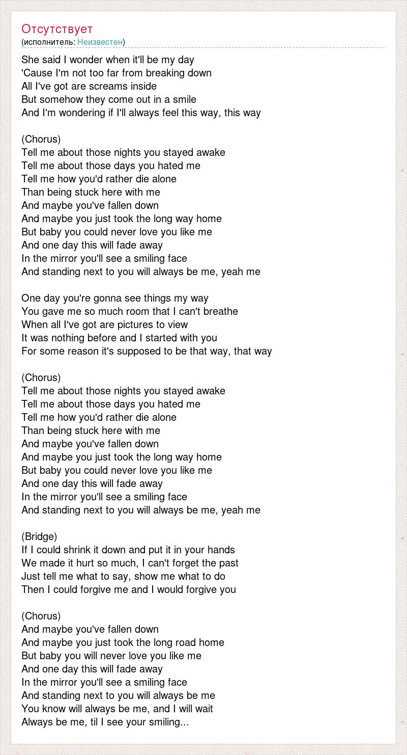 She said I wonder when it'll be my day 'Cause I'm not too far from breaking down All I've got are screams inside But somehow they come out in a smile And I'm wondering if I'll always feel this way, this way (Chorus) Tell me about those nights you stayed awake Tell me about those days you hated me Tell me how you'd rather die alone Than being stuck here with me And maybe you've fallen down And maybe you just took the long way home But baby you could never love you like me And one day this will fade away In the mirror you'll see a smiling face And standing next to you will always be me, yeah me One day you're gonna see things my way You gave me so much room that I can't breathe When all I've got are pictures to view It was nothing before and I started with you For some reason it's supposed to be that way, that way (Chorus) Tell me about those nights you stayed awake Tell me about those days you hated me Tell me how you'd rather die alone Than being stuck here with me And maybe you've fallen down And maybe you just took the long way home But baby you could never love you like me And one day this will fade away In the mirror you'll see a smiling face And standing next to you will always be me, yeah me (Bridge) If I could shrink it down and put it in your hands We made it hurt so much, I can't forget the past Just tell me what to say, show me what to do Then I could forgive me and I would forgive you (Chorus) And maybe you've fallen down And maybe you just took the long road home But baby you will never love you like me And one day this will fade away In the mirror you'll see a smiling face And standing next to you will always be me You know will always be me, and I will wait Always be me, til I see your smiling...