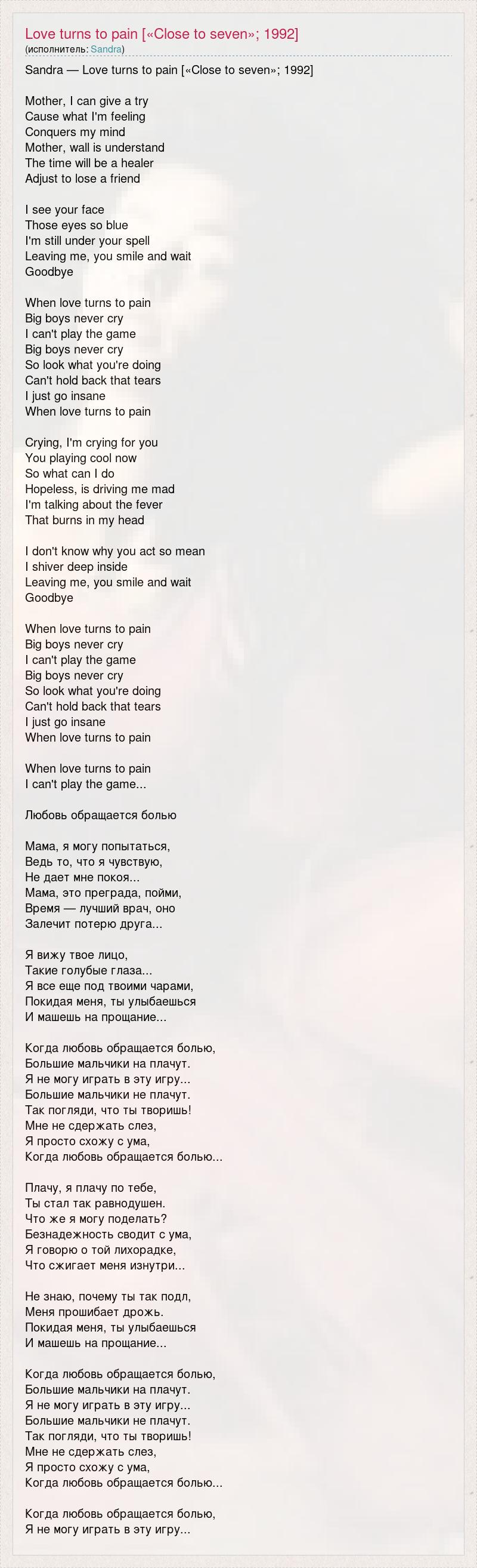 Sandra — Love turns to pain [«Close to seven»; 1992] Mother, I can give a try Cause what I'm feeling Conquers my mind Mother, wall is understand The time will be a healer Adjust to lose a friend I see your face Those eyes so blue I'm still under your spell Leaving me, you smile and wait Goodbye When love turns to pain Big boys never cry I can't play the game Big boys never cry So look what you're doing Can't hold back that tears I just go insane When love turns to pain Crying, I'm crying for you You playing cool now So what can I do Hopeless, is driving me mad I'm talking about the fever That burns in my head I don't know why you act so mean I shiver deep inside Leaving me, you smile and wait Goodbye When love turns to pain Big boys never cry I can't play the game Big boys never cry So look what you're doing Can't hold back that tears I just go insane When love turns to pain When love turns to pain I can't play the game... Любовь обращается болью Мама, я могу попытаться, Ведь то, что я чувствую, Не дает мне покоя... Мама, это преграда, пойми, Время — лучший врач, оно Залечит потерю друга... Я вижу твое лицо, Такие голубые глаза... Я все еще под твоими чарами, Покидая меня, ты улыбаешься И машешь на прощание... Когда любовь обращается болью, Большие мальчики на плачут. Я не могу играть в эту игру... Большие мальчики не плачут. Так погляди, что ты творишь! Мне не сдержать слез, Я просто схожу с ума, Когда любовь обращается болью... Плачу, я плачу по тебе, Ты стал так равнодушен. Что же я могу поделать? Безнадежность сводит с ума, Я говорю о той лихорадке, Что сжигает меня изнутри... Не знаю, почему ты так подл, Меня прошибает дрожь. Покидая меня, ты улыбаешься И машешь на прощание... Когда любовь обращается болью, Большие мальчики на плачут. Я не могу играть в эту игру... Большие мальчики не плачут. Так погляди, что ты творишь! Мне не сдержать слез, Я просто схожу с ума, Когда любовь обращается болью... Когда любовь обращается болью, Я не могу играть в эту игру...