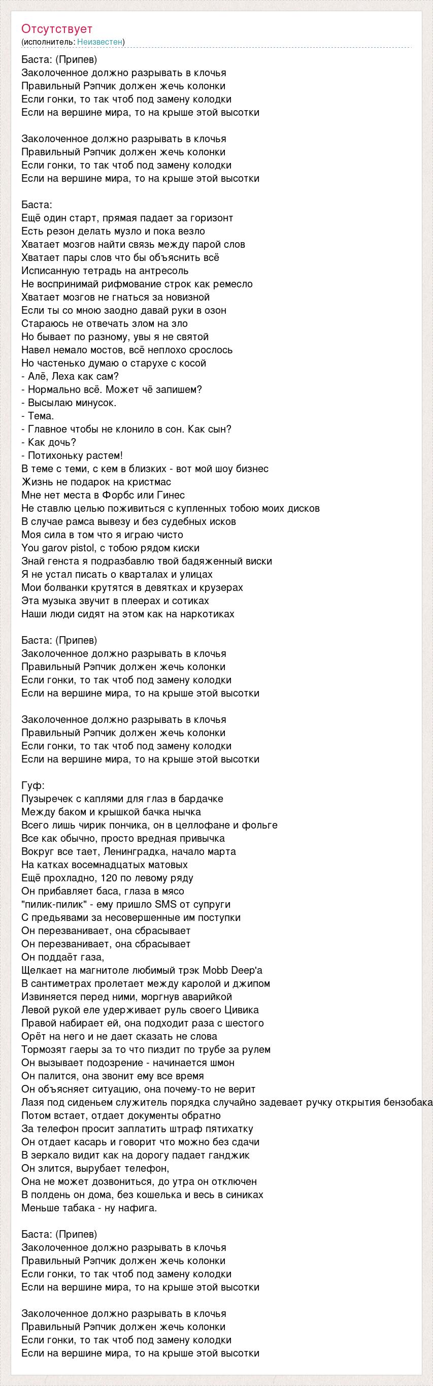 Баста: (Припев) Заколоченное должно разрывать в клочья Правильный Рэпчик должен жечь колонки Если гонки, то так чтоб под замену колодки Если на вершине мира, то на крыше этой высотки Заколоченное должно разрывать в клочья Правильный Рэпчик должен жечь колонки Если гонки, то так чтоб под замену колодки Если на вершине мира, то на крыше этой высотки Баста: Ещё один старт, прямая падает за горизонт Есть резон делать музло и пока везло Хватает мозгов найти связь между парой слов Хватает пары слов что бы объяснить всё Исписанную тетрадь на антресоль Не воспринимай рифмование строк как ремесло Хватает мозгов не гнаться за новизной Если ты со мною заодно давай руки в озон Стараюсь не отвечать злом на зло Но бывает по разному, увы я не святой Навел немало мостов, всё неплохо срослось Но частенько думаю о старухе с косой - Алё, Леха как сам? - Нормально всё. Может чё запишем? - Высылаю минусок. - Тема. - Главное чтобы не клонило в сон. Как сын? - Как дочь? - Потихоньку растем! В теме с теми, с кем в близких - вот мой шоу бизнес Жизнь не подарок на кристмас Мне нет места в Форбс или Гинес Не ставлю целью поживиться с купленных тобою моих дисков В случае рамса вывезу и без судебных исков Моя сила в том что я играю чисто You garov pistol, с тобою рядом киски Знай генста я подразбавлю твой бадяженный виски Я не устал писать о кварталах и улицах Мои болванки крутятся в девятках и крузерах Эта музыка звучит в плеерах и сотиках Наши люди сидят на этом как на наркотиках Баста: (Припев) Заколоченное должно разрывать в клочья Правильный Рэпчик должен жечь колонки Если гонки, то так чтоб под замену колодки Если на вершине мира, то на крыше этой высотки Заколоченное должно разрывать в клочья Правильный Рэпчик должен жечь колонки Если гонки, то так чтоб под замену колодки Если на вершине мира, то на крыше этой высотки Гуф: Пузыречек с каплями для глаз в бардачке Между баком и крышкой бачка нычка Всего лишь чирик пончика, он в целлофане и фольге Все как обычно, просто вредная привычка Вокруг все тает, Ленинградка, начало марта На катках восемнадцатых матовых Ещё прохладно, 120 по левому ряду Он прибавляет баса, глаза в мясо "пилик-пилик" - ему пришло SMS от супруги С предьявами за несовершенные им поступки Он перезванивает, она сбрасывает Он перезванивает, она сбрасывает Он поддаёт газа, Щелкает на магнитоле любимый трэк Mobb Deep'а В сантиметрах пролетает между каролой и джипом Извиняется перед ними, моргнув аварийкой Левой рукой еле удерживает руль своего Цивика Правой набирает ей, она подходит раза с шестого Орёт на него и не дает сказать не слова Тормозят гаеры за то что пиздит по трубе за рулем Он вызывает подозрение - начинается шмон Он палится, она звонит ему все время Он объясняет ситуацию, она почему-то не верит Лазя под сиденьем служитель порядка случайно задевает ручку открытия бензобака Потом встает, отдает документы обратно За телефон просит заплатить штраф пятихатку Он отдает касарь и говорит что можно без сдачи В зеркало видит как на дорогу падает ганджик Он злитcя, вырубает телефон, Она не может дозвониться, до утра он отключен В полдень он дома, без кошелька и весь в синиках Меньше табака - ну нафига. Баста: (Припев) Заколоченное должно разрывать в клочья Правильный Рэпчик должен жечь колонки Если гонки, то так чтоб под замену колодки Если на вершине мира, то на крыше этой в