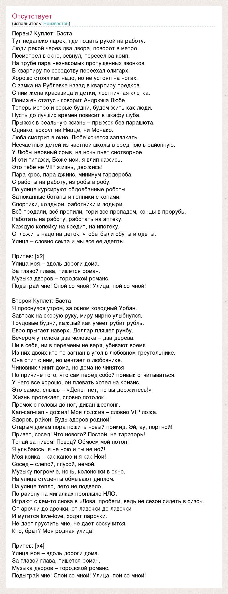 Первый Куплет: Баста Тут недалеко ларек, где подать рукой на работу. Люди рекой через два двора, поворот в метро. Посмотрел в окно, зевнул, пересел за комп. На трубе пара незнакомых пропущенных звонков. В квартиру по соседству переехал олигарх. Хорошо стоял как надо, но не устоял на ногах. С замка на Рублевке назад в квартиру предков. С ним жена красавица и детки, лестничная клетка. Понижен статус - говорит Андрюша Любе, Теперь метро и серые будни, будем жить как люди. Пусть до лучших времен повисит в шкафу шуба. Прыжок в реальную жизнь – прыжок без парашюта. Однако, вокруг ни Ницце, ни Монако. Люба смотрит в окно, Любе хочется заплакать. Несчастных детей из частной школы в среднюю в районную. У Любы нервный срыв, на ночь пьет снотворное. И эти типажи, Боже мой, я влип кажись. Это тебе не VIP жизнь, держись! Пара крос, пара джинс, минимум гардероба. С работы на работу, из робы в робу. По улице курсируют обдолбанные роботы. Затюканные ботаны и гопники с копами. Спортики, колдыри, работники и лодыри. Всё продали, всё пропили, гори все пропадом, концы в прорубь. Работать на работу, работать на аптеку. Каждую копейку на кредит, на ипотеку. Отложить надо на деток, чтобы были обуты и одеты. Улица – словно секта и мы все ее адепты. Припев: [x2] Улица моя – вдоль дороги дома. За главой глава, пишется роман. Музыка дворов – городской романс. Подыграй мне! Спой со мной! Улица, пой со мной! Второй Куплет: Баста Я проснулся утром, за окном холодный Урбан. Завтрак на скорую руку, миру мирно улыбнулся. Трудовые будни, каждый как умеет рубит рубль. Евро прыгает наверх, Доллар пляшет румбу. Вечером у телека два человека – два дерева. Ни в себя, ни в перемены не веря, убивают время. Из них двоих кто-то загнан в угол в любовном треугольнике. Она спит с ним, но мечтает о любовнике. Чиновник чинит дома, но дома не чинятся По причине того, что сам перед собой привык отчитываться. У него все хорошо, он плевать хотел на кризис. Это самое, слышь – «Денег нет, но вы держитесь!» Жизнь протекает, словно потолок. Промок с головы до ног, диван шезлонг. Кап-кап-кап - дожил! Моя лоджия – словно VIP ложа. Здоров, район! Будь здоров родной! Старым домам пора пошить новый прикид. Эй, ау, портной! Привет, сосед! Что нового? Постой, не тараторь! Топай за пивом! Повод? Обмоем мой потоп! Я улыбаюсь, я не ною и ты не ной! Моя койка – как каноэ и я как Ной! Сосед – слепой, глухой, немой. Музыку погромче, ночь, колоночки в окно. На улице студенты обмывают диплом. На улице тепло, лето не подвело. По району на мигалках проплыло НЛО. Играют с кем-то снова в «Лова, пробеги, ведь не сезон сидеть в сизо». От арочки до арочки, от лавочки до лавочки И мутится love-love, ходят парочки. Не дает грустить мне, не дает соскучится. Кто, брат? Моя родная улица! Припев: [x4] Улица моя – вдоль дороги дома. За главой глава, пишется роман. Музыка дворов – городской романс. Подыграй мне! Спой со мной! Улица, пой со мной!