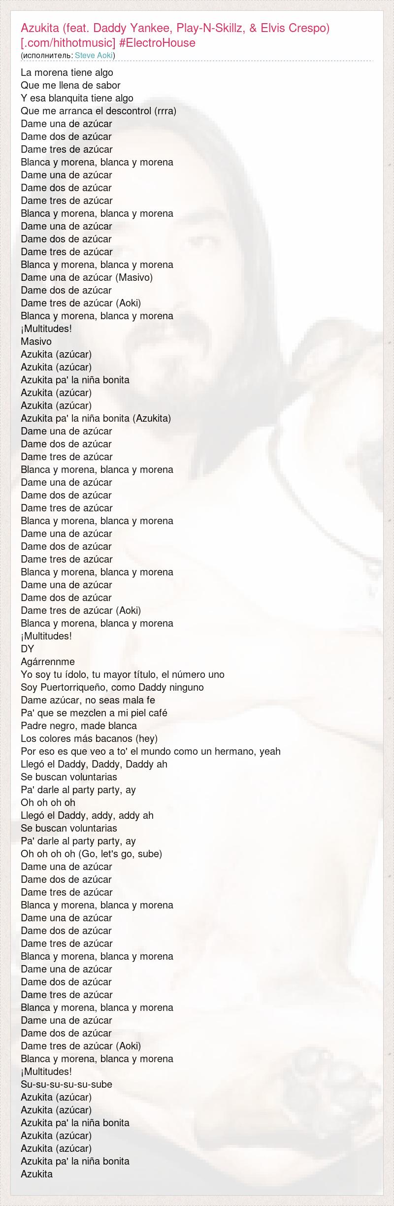 La morena tiene algo Que me llena de sabor Y esa blanquita tiene algo Que me arranca el descontrol (rrra) Dame una de azúcar Dame dos de azúcar Dame tres de azúcar Blanca y morena, blanca y morena Dame una de azúcar Dame dos de azúcar Dame tres de azúcar Blanca y morena, blanca y morena Dame una de azúcar Dame dos de azúcar Dame tres de azúcar Blanca y morena, blanca y morena Dame una de azúcar (Masivo) Dame dos de azúcar Dame tres de azúcar (Aoki) Blanca y morena, blanca y morena ¡Multitudes! Masivo Azukita (azúcar) Azukita (azúcar) Azukita pa' la niña bonita Azukita (azúcar) Azukita (azúcar) Azukita pa' la niña bonita (Azukita) Dame una de azúcar Dame dos de azúcar Dame tres de azúcar Blanca y morena, blanca y morena Dame una de azúcar Dame dos de azúcar Dame tres de azúcar Blanca y morena, blanca y morena Dame una de azúcar Dame dos de azúcar Dame tres de azúcar Blanca y morena, blanca y morena Dame una de azúcar Dame dos de azúcar Dame tres de azúcar (Aoki) Blanca y morena, blanca y morena ¡Multitudes! DY Agárrennme Yo soy tu ídolo, tu mayor título, el número uno Soy Puertorriqueño, como Daddy ninguno Dame azúcar, no seas mala fe Pa' que se mezclen a mi piel café Padre negro, made blanca Los colores más bacanos (hey) Por eso es que veo a to' el mundo como un hermano, yeah Llegó el Daddy, Daddy, Daddy ah Se buscan voluntarias Pa' darle al party party, ay Oh oh oh oh Llegó el Daddy, addy, addy ah Se buscan voluntarias Pa' darle al party party, ay Oh oh oh oh (Go, let's go, sube) Dame una de azúcar Dame dos de azúcar Dame tres de azúcar Blanca y morena, blanca y morena Dame una de azúcar Dame dos de azúcar Dame tres de azúcar Blanca y morena, blanca y morena Dame una de azúcar Dame dos de azúcar Dame tres de azúcar Blanca y morena, blanca y morena Dame una de azúcar Dame dos de azúcar Dame tres de azúcar (Aoki) Blanca y morena, blanca y morena ¡Multitudes! Su-su-su-su-su-sube Azukita (azúcar) Azukita (azúcar) Azukita pa' la niña bonita Azukita (azúcar) Azukita (azúcar) Azukita pa' la niña bonita Azukita
