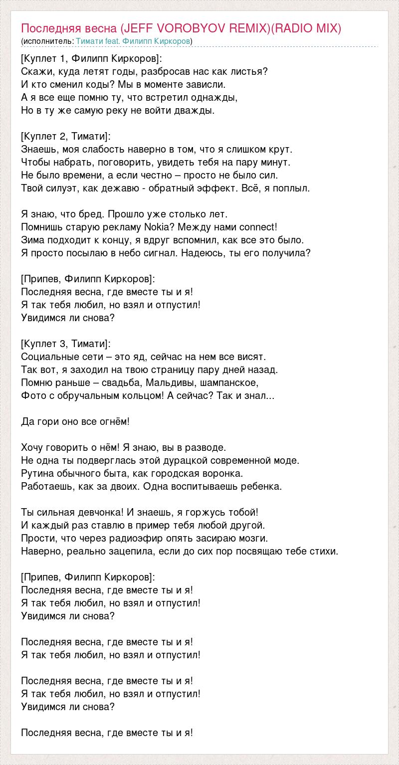 [Куплет 1, Филипп Киркоров]: Скажи, куда летят годы, разбросав нас как листья? И кто сменил коды? Мы в моменте зависли. А я все еще помню ту, что встретил однажды, Но в ту же самую реку не войти дважды. [Куплет 2, Тимати]: Знаешь, моя слабость наверно в том, что я слишком крут. Чтобы набрать, поговорить, увидеть тебя на пару минут. Не было времени, а если честно – просто не было сил. Твой силуэт, как дежавю - обратный эффект. Всё, я поплыл. Я знаю, что бред. Прошло уже столько лет. Помнишь старую рекламу Nokia? Между нами connect! Зима подходит к концу, я вдруг вспомнил, как все это было. Я просто посылаю в небо сигнал. Надеюсь, ты его получила? [Припев, Филипп Киркоров]: Последняя весна, где вместе ты и я! Я так тебя любил, но взял и отпустил! Увидимся ли снова? [Куплет 3, Тимати]: Социальные сети – это яд, сейчас на нем все висят. Так вот, я заходил на твою страницу пару дней назад. Помню раньше – свадьба, Мальдивы, шампанское, Фото с обручальным кольцом! А сейчас? Так и знал... Да гори оно все огнём! Хочу говорить о нём! Я знаю, вы в разводе. Не одна ты подверглась этой дурацкой современной моде. Рутина обычного быта, как городская воронка. Работаешь, как за двоих. Одна воспитываешь ребенка. Ты сильная девчонка! И знаешь, я горжусь тобой! И каждый раз ставлю в пример тебя любой другой. Прости, что через радиоэфир опять засираю мозги. Наверно, реально зацепила, если до сих пор посвящаю тебе стихи. [Припев, Филипп Киркоров]: Последняя весна, где вместе ты и я! Я так тебя любил, но взял и отпустил! Увидимся ли снова? Последняя весна, где вместе ты и я! Я так тебя любил, но взял и отпустил! Последняя весна, где вместе ты и я! Я так тебя любил, но взял и отпустил! Увидимся ли снова? Последняя весна, где вместе ты и я!