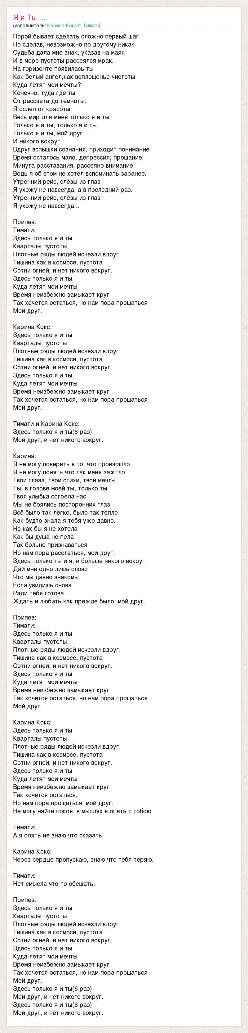 Порой бывает сделать сложно первый шаг Но сделав, невозможно по другому никак Судьба дала мне знак, указав на маяк И в море пустоты рассеялся мрак. На горизонте появилась ты Как белый ангел,как воплощенье чистоты Куда летят мои мечты? Конечно, туда где ты От рассвета до темноты. Я ослеп от красоты Весь мир для меня только я и ты Только я и ты, только я и ты Только я и ты, мой друг И никого вокруг. Вдруг вспышки сознания, приходит понимание Время осталось мало, депрессия, прощание, Минута расставания, рассеяно внимание Ведь я об этом не хотел вспоминать заранее. Утренний рейс, слёзы из глаз Я ухожу не навсегда, а в последний раз. Утренний рейс, слёзы из глаз Я ухожу не навсегда... Припев: Тимати: Здесь только я и ты Кварталы пустоты Плотные ряды людей исчезли вдруг. Тишина как в космосе, пустота Сотни огней, и нет никого вокруг. Здесь только я и ты Куда летят мои мечты Время неизбежно замыкает круг Так хочется остаться, но нам пора прощаться Мой друг. Карина Кокс: Здесь только я и ты Кварталы пустоты Плотные ряды людей исчезли вдруг. Тишина как в космосе, пустота Сотни огней, и нет никого вокруг. Здесь только я и ты Куда летят мои мечты Время неизбежно замыкает круг Так хочется остаться, но нам пора прощаться Мой друг. Тимати и Карина Кокс: Здесь только я и ты(6 раз) Мой друг, и нет никого вокруг. Карина: Я не могу поверить в то, что произошло Я не могу понять что так меня зажгло Твои глаза, твои стихи, твои мечты Ты, в голове моей ты, только ты Твоя улыбка согрела нас Мы не боялись посторонних глаз Всё было так легко, было так тепло Как будто знала я тебя уже давно. Но как бы я не хотела Как бы душа не пела Так больно признаваться Но нам пора расстаться, мой друг. Здесь только ты и я, и больше никого вокруг. Дай мне одно лишь слово Что мы давно знакомы Если увидишь снова Ради тебя готова Ждать и любить как прежде было, мой друг. Припев: Тимати: Здесь только я и ты Кварталы пустоты Плотные ряды людей исчезли вдруг. Тишина как в космосе, пустота Сотни огней, и нет никого вокруг. Здесь только я и ты Куда летят мои мечты Время неизбежно замыкает круг Так хочется остаться, но нам пора прощаться Мой друг. Карина Кокс: Здесь только я и ты Кварталы пустоты Плотные ряды людей исчезли вдруг. Тишина как в космосе, пустота Сотни огней, и нет никого вокруг. Здесь только я и ты Куда летят мои мечты Время неизбежно замыкает круг Так хочется остаться, Но нам пора прощаться, мой друг. Не могу найти покоя, в мыслях я опять с тобою. Тимати: А я опять не знаю что сказать. Карина Кокс: Через сердце пропускаю, знаю что тебя теряю. Тимати: Нет смысла что-то обещать. Припев: Здесь только я и ты Кварталы пустоты Плотные ряды людей исчезли вдруг. Тишина как в космосе, пустота Сотни огней, и нет никого вокруг. Здесь только я и ты Куда летят мои мечты Время неизбежно замыкает круг Так хочется остаться, но нам пора прощаться Мой друг. Здесь только я и ты(6 раз) Мой друг, и нет никого вокруг. Здесь только я и ты(6 раз) Мой друг, и нет никого вокруг.