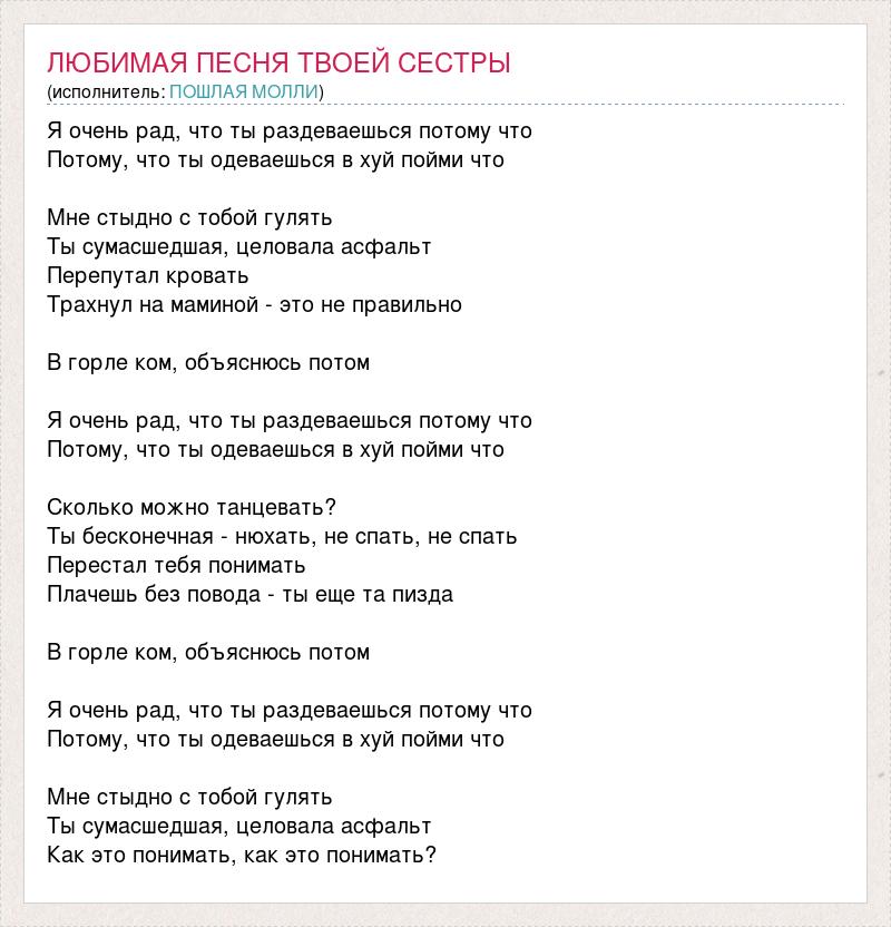 Я очень рад, что ты раздеваешься потому что Потому, что ты одеваешься в хуй пойми что Мне стыдно с тобой гулять Ты сумасшедшая, целовала асфальт Перепутал кровать Трахнул на маминой - это не правильно В горле ком, объяснюсь потом Я очень рад, что ты раздеваешься потому что Потому, что ты одеваешься в хуй пойми что Сколько можно танцевать? Ты бесконечная - нюхать, не спать, не спать Перестал тебя понимать Плачешь без повода - ты еще та пизда В горле ком, объяснюсь потом Я очень рад, что ты раздеваешься потому что Потому, что ты одеваешься в хуй пойми что Мне стыдно с тобой гулять Ты сумасшедшая, целовала асфальт Как это понимать, как это понимать?