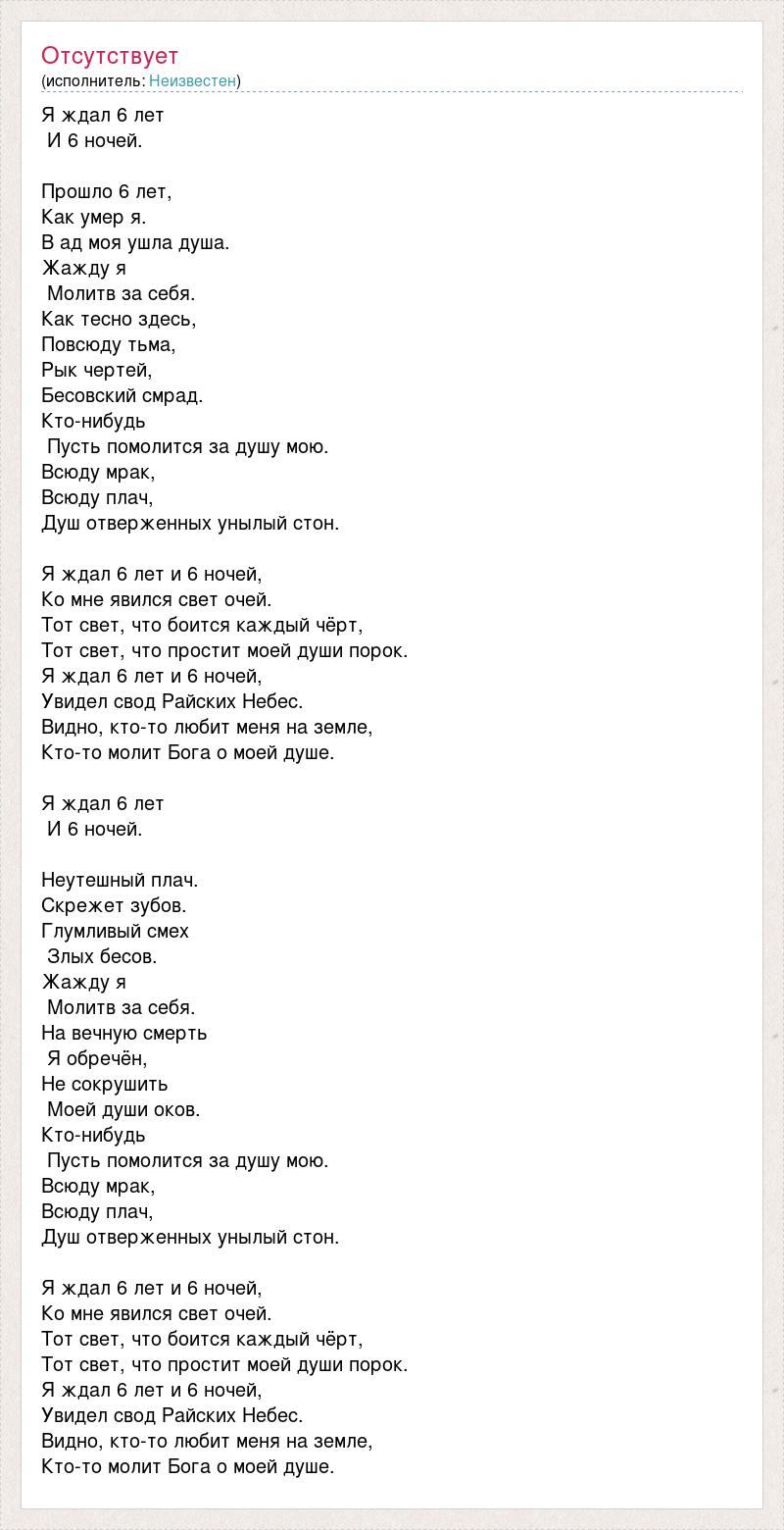 Я ждал 6 лет И 6 ночей. Прошло 6 лет, Как умер я. В ад моя ушла душа. Жажду я Молитв за себя. Как тесно здесь, Повсюду тьма, Рык чертей, Бесовский смрад. Кто-нибудь Пусть помолится за душу мою. Всюду мрак, Всюду плач, Душ отверженных унылый стон. Я ждал 6 лет и 6 ночей, Ко мне явился свет очей. Тот свет, что боится каждый чёрт, Тот свет, что простит моей души порок. Я ждал 6 лет и 6 ночей, Увидел свод Райских Небес. Видно, кто-то любит меня на земле, Кто-то молит Бога о моей душе. Я ждал 6 лет И 6 ночей. Неутешный плач. Скрежет зубов. Глумливый смех Злых бесов. Жажду я Молитв за себя. На вечную смерть Я обречён, Не сокрушить Моей души оков. Кто-нибудь Пусть помолится за душу мою. Всюду мрак, Всюду плач, Душ отверженных унылый стон. Я ждал 6 лет и 6 ночей, Ко мне явился свет очей. Тот свет, что боится каждый чёрт, Тот свет, что простит моей души порок. Я ждал 6 лет и 6 ночей, Увидел свод Райских Небес. Видно, кто-то любит меня на земле, Кто-то молит Бога о моей душе.