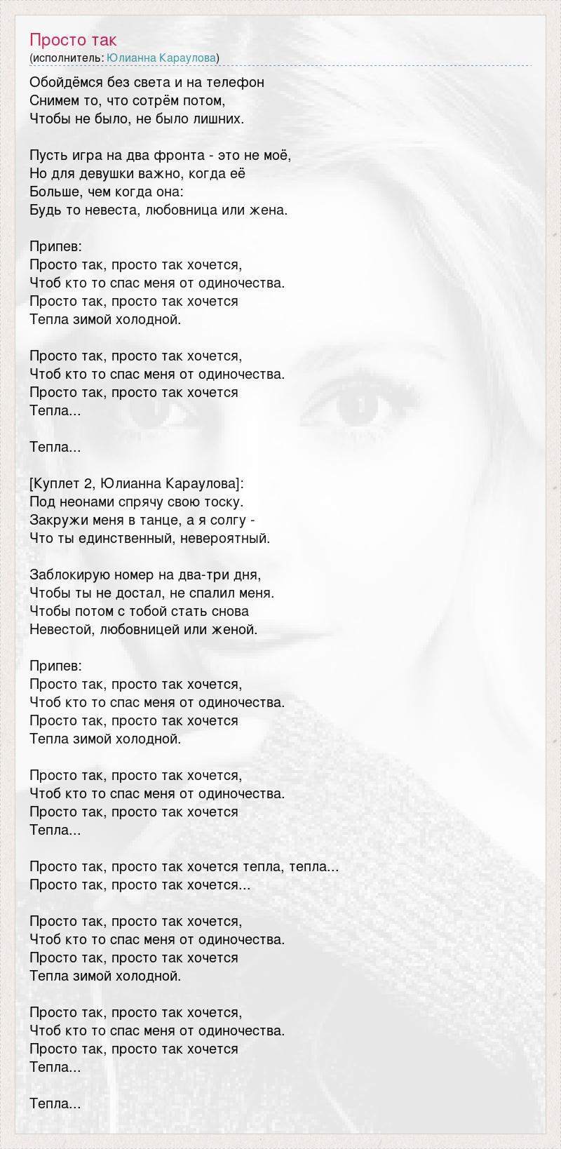 Обойдёмся без света и на телефон Снимем то, что сотрём потом, Чтобы не было, не было лишних. Пусть игра на два фронта - это не моё, Но для девушки важно, когда её Больше, чем когда она: Будь то невеста, любовница или жена. Припев: Просто так, просто так хочется, Чтоб кто то спас меня от одиночества. Просто так, просто так хочется Тепла зимой холодной. Просто так, просто так хочется, Чтоб кто то спас меня от одиночества. Просто так, просто так хочется Тепла... Тепла... [Куплет 2, Юлианна Караулова]: Под неонами спрячу свою тоску. Закружи меня в танце, а я солгу - Что ты единственный, невероятный. Заблокирую номер на два-три дня, Чтобы ты не достал, не спалил меня. Чтобы потом с тобой стать снова Невестой, любовницей или женой. Припев: Просто так, просто так хочется, Чтоб кто то спас меня от одиночества. Просто так, просто так хочется Тепла зимой холодной. Просто так, просто так хочется, Чтоб кто то спас меня от одиночества. Просто так, просто так хочется Тепла... Просто так, просто так хочется тепла, тепла... Просто так, просто так хочется... Просто так, просто так хочется, Чтоб кто то спас меня от одиночества. Просто так, просто так хочется Тепла зимой холодной. Просто так, просто так хочется, Чтоб кто то спас меня от одиночества. Просто так, просто так хочется Тепла... Тепла...