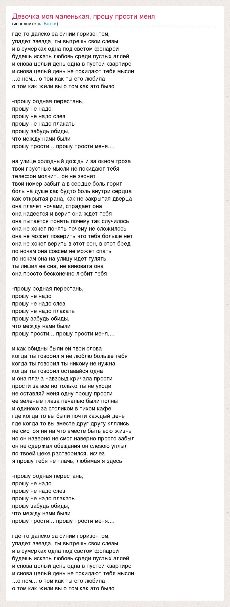 где-то далеко за синим горизонтом, упадет звезда, ты вытрешь свои слезы и в сумерках одна под светом фонарей будешь искать любовь среди пустых аллей и снова целый день одна в пустой квартире и снова целый день не покидают тебя мысли ...о нем... о том как ты его любила о том как жили вы о том как это было -прошу родная перестань, прошу не надо прошу не надо слез прошу не надо плакать прошу забудь обиды, что между нами были прошу прости... прошу прости меня.... на улице холодный дождь и за окном гроза твои грустные мысли не покидают тебя телефон молчит.. он не звонит твой номер забыт а в сердце боль горит боль на душе как будто боль внутри сердца как открытая рана, как не закрытая дверца она плачет ночами, страдает она она надеется и верит она ждет тебя она пытается понять почему так случилось она не хочет понять почему не сложилось она не может поверить что тебя больше нет она не хочет верить в этот сон, в этот бред по ночам она совсем не может спать по ночам она на улицу идет гулять ты лишил ее сна, не виновата она она просто бесконечно любит тебя -прошу родная перестань, прошу не надо прошу не надо слез прошу не надо плакать прошу забудь обиды, что между нами были прошу прости... прошу прости меня.... и как обидны были ей твои слова когда ты говорил я не люблю больше тебя когда ты говорил ты никому не нужна когда ты говорил оставайся одна и она плача навзрыд кричала прости прости за все но только ты не уходи не оставляй меня одну прошу прости ее зеленые глаза печалью были полны и одиноко за столиком в тихом кафе где когда то вы были почти каждый день где когда то вы вместе друг другу клялись не смотря ни на что вместе быть всю жизнь но он наверно не смог наверно просто забыл он не сдержал обещания он слезою уплыл по твоей щеке растворился, исчез я прошу тебя не плачь, любимая я здесь -прошу родная перестань, прошу не надо прошу не надо слез прошу не надо плакать прошу забудь обиды, что между нами были прошу прости... прошу прости меня.... где-то далеко за синим горизонтом, упадет звезда, ты вытрешь свои слезы и в сумерках одна под светом фонарей будешь искать любовь среди пустых аллей и снова целый день одна в пустой квартире и снова целый день не покидают тебя мысли ...о нем... о том как ты его любила о том как жили вы о том как это было