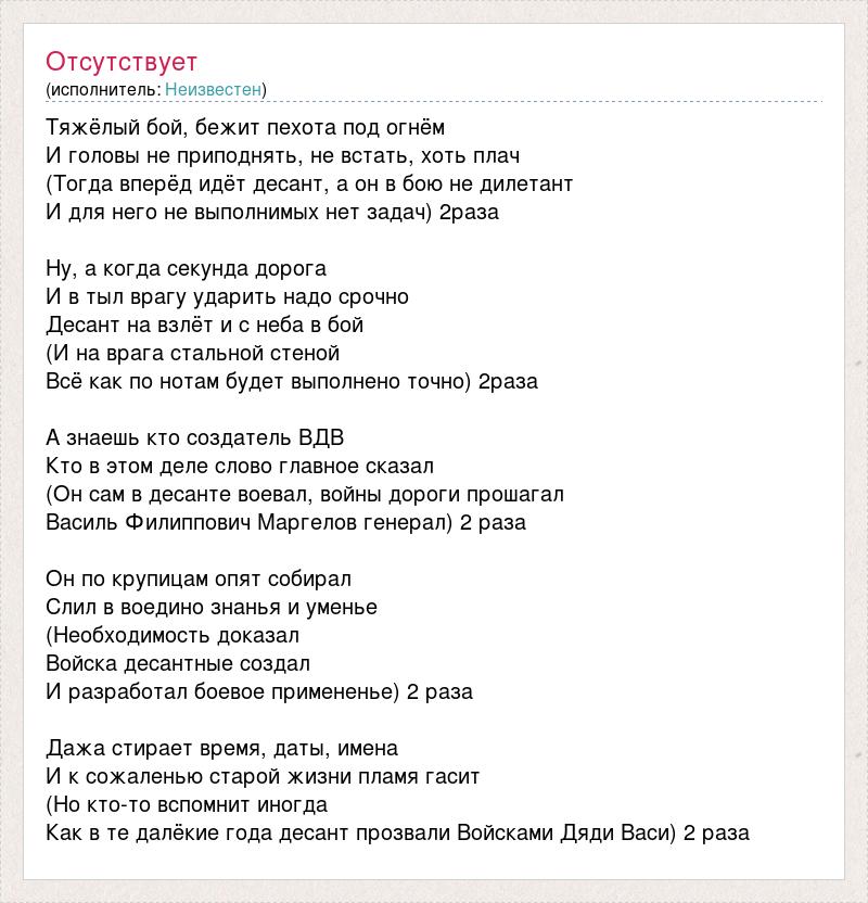 Тяжёлый бой, бежит пехота под огнём И головы не приподнять, не встать, хоть плач (Тогда вперёд идёт десант, а он в бою не дилетант И для него не выполнимых нет задач) 2раза Ну, а когда секунда дорога И в тыл врагу ударить надо срочно Десант на взлёт и с неба в бой (И на врага стальной стеной Всё как по нотам будет выполнено точно) 2раза А знаешь кто создатель ВДВ Кто в этом деле слово главное сказал (Он сам в десанте воевал, войны дороги прошагал Василь Филиппович Маргелов генерал) 2 раза Он по крупицам опят собирал Слил в воедино знанья и уменье (Необходимость доказал Войска десантные создал И разработал боевое примененье) 2 раза Дажа стирает время, даты, имена И к сожаленью старой жизни пламя гасит (Но кто-то вспомнит иногда Как в те далёкие года десант прозвали Войсками Дяди Васи) 2 раза