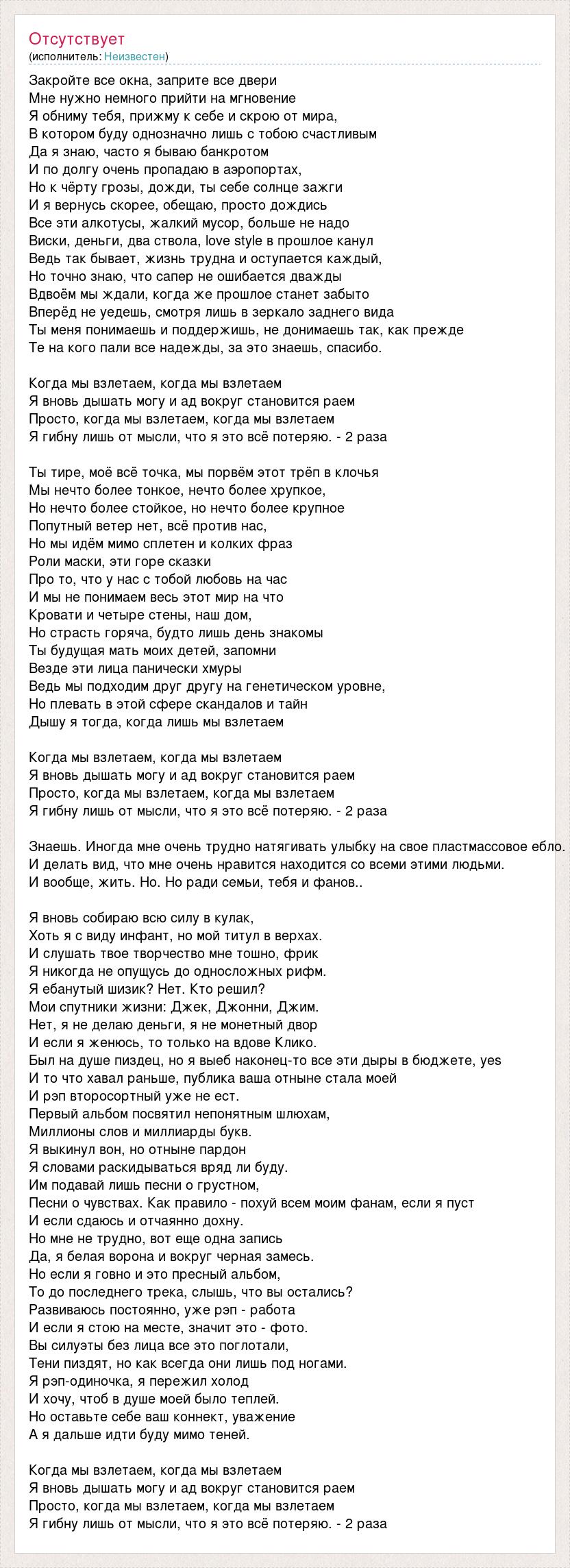 Закройте все окна, заприте все двери Мне нужно немного прийти на мгновение Я обниму тебя, прижму к себе и скрою от мира, В котором буду однозначно лишь с тобою счастливым Да я знаю, часто я бываю банкротом И по долгу очень пропадаю в аэропортах, Но к чёрту грозы, дожди, ты себе солнце зажги И я вернусь скорее, обещаю, просто дождись Все эти алкотусы, жалкий мусор, больше не надо Виски, деньги, два ствола, love style в прошлое канул Ведь так бывает, жизнь трудна и оступается каждый, Но точно знаю, что сапер не ошибается дважды Вдвоём мы ждали, когда же прошлое станет забыто Вперёд не уедешь, смотря лишь в зеркало заднего вида Ты меня понимаешь и поддержишь, не донимаешь так, как прежде Те на кого пали все надежды, за это знаешь, спасибо. Когда мы взлетаем, когда мы взлетаем Я вновь дышать могу и ад вокруг становится раем Просто, когда мы взлетаем, когда мы взлетаем Я гибну лишь от мысли, что я это всё потеряю. - 2 раза Ты тире, моё всё точка, мы порвём этот трёп в клочья Мы нечто более тонкое, нечто более хрупкое, Но нечто более стойкое, но нечто более крупное Попутный ветер нет, всё против нас, Но мы идём мимо сплетен и колких фраз Роли маски, эти горе сказки Про то, что у нас с тобой любовь на час И мы не понимаем весь этот мир на что Кровати и четыре стены, наш дом, Но страсть горяча, будто лишь день знакомы Ты будущая мать моих детей, запомни Везде эти лица панически хмуры Ведь мы подходим друг другу на генетическом уровне, Но плевать в этой сфере скандалов и тайн Дышу я тогда, когда лишь мы взлетаем Когда мы взлетаем, когда мы взлетаем Я вновь дышать могу и ад вокруг становится раем Просто, когда мы взлетаем, когда мы взлетаем Я гибну лишь от мысли, что я это всё потеряю. - 2 раза Знаешь. Иногда мне очень трудно натягивать улыбку на свое пластмассовое ебло. И делать вид, что мне очень нравится находится со всеми этими людьми. И вообще, жить. Но. Но ради семьи, тебя и фанов.. Я вновь собираю всю силу в кулак, Хоть я с виду инфант, но мой титул в верхах. И слушать твое творчество мне тошно, фрик Я никогда не опущусь до односложных рифм. Я ебанутый шизик? Нет. Кто решил? Мои спутники жизни: Джек, Джонни, Джим. Нет, я не делаю деньги, я не монетный двор И если я женюсь, то только на вдове Клико. Был на душе пиздец, но я выеб наконец-то все эти дыры в бюджете, yes И то что хавал раньше, публика ваша отныне стала моей И рэп второсортный уже не ест. Первый альбом посвятил непонятным шлюхам, Миллионы слов и миллиарды букв. Я выкинул вон, но отныне пардон Я словами раскидываться вряд ли буду. Им подавай лишь песни о грустном, Песни о чувствах. Как правило - похуй всем моим фанам, если я пуст И если сдаюсь и отчаянно дохну. Но мне не трудно, вот еще одна запись Да, я белая ворона и вокруг черная замесь. Но если я говно и это пресный альбом, То до последнего трека, слышь, что вы остались? Развиваюсь постоянно, уже рэп - работа И если я стою на месте, значит это - фото. Вы силуэты без лица все это поглотали, Тени пиздят, но как всегда они лишь под ногами. Я рэп-одиночка, я пережил холод И хочу, чтоб в душе моей было теплей. Но оставьте себе ваш коннект, уважение А я дальше идти буду мимо теней. Когда мы взлетаем, когда мы взлетаем Я вновь дышать могу и ад вокруг становится раем Просто, когда мы взлетаем, когда мы взлетаем Я гибну лишь от мысли, что я это всё потеряю. - 2 раза
