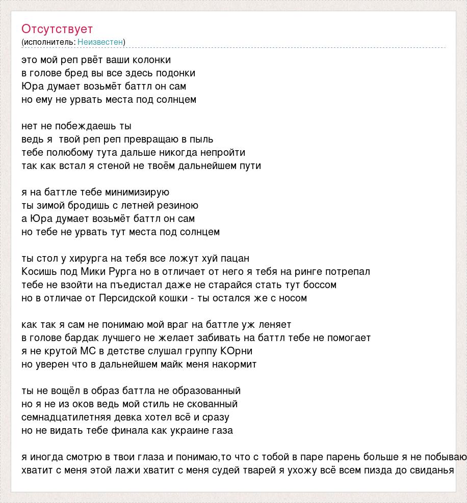 это мой реп рвёт ваши колонки в голове бред вы все здесь подонки Юра думает возьмёт баттл он сам но ему не урвать места под солнцем нет не побеждаешь ты ведь я твой реп реп превращаю в пыль тебе полюбому тута дальше никогда непройти так как встал я стеной не твоём дальнейшем пути я на баттле тебе минимизирую ты зимой бродишь с летней резиною а Юра думает возьмёт баттл он сам но тебе не урвать тут места под солнцем ты стол у хирурга на тебя все ложут хуй пацан Косишь под Мики Рурга но в отличает от него я тебя на ринге потрепал тебе не взойти на пъедистал даже не старайся стать тут боссом но в отличае от Персидской кошки - ты остался же с носом как так я сам не понимаю мой враг на баттле уж леняет в голове бардак лучшего не желает забивать на баттл тебе не помогает я не крутой МС в детстве слушал группу КОрни но уверен что в дальнейшем майк меня накормит ты не вощёл в образ баттла не образованный но я не из оков ведь мой стиль не скованный семнадцатилетняя девка хотел всё и сразу но не видать тебе финала как украине газа я иногда смотрю в твои глаза и понимаю,то что с тобой в паре парень больше я не побываю хватит с меня этой лажи хватит с меня судей тварей я ухожу всё всем пизда до свиданья