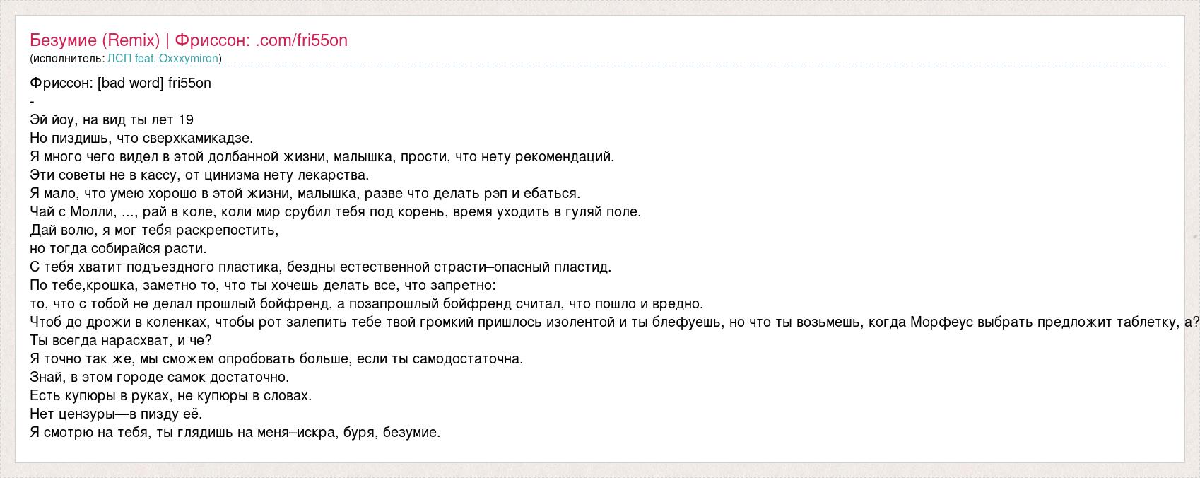 Фриссон: [bad word] fri55on - Эй йоу, на вид ты лет 19 Но пиздишь, что сверхкамикадзе. Я много чего видел в этой долбанной жизни, малышка, прости, что нету рекомендаций. Эти советы не в кассу, от цинизма нету лекарства. Я мало, что умею хорошо в этой жизни, малышка, разве что делать рэп и ебаться. Чай с Молли, ..., рай в коле, коли мир срубил тебя под корень, время уходить в гуляй поле. Дай волю, я мог тебя раскрепостить, но тогда собирайся расти. С тебя хватит подъездного пластика, бездны естественной страсти–опасный пластид. По тебе,крошка, заметно то, что ты хочешь делать все, что запретно: то, что с тобой не делал прошлый бойфренд, а позапрошлый бойфренд считал, что пошло и вредно. Чтоб до дрожи в коленках, чтобы рот залепить тебе твой громкий пришлось изолентой и ты блефуешь, но что ты возьмешь, когда Морфеус выбрать предложит таблетку, а? Ты всегда нарасхват, и че? Я точно так же, мы сможем опробовать больше, если ты самодостаточна. Знай, в этом городе самок достаточно. Есть купюры в руках, не купюры в словах. Нет цензуры—в пизду её. Я смотрю на тебя, ты глядишь на меня–искра, буря, безумие.