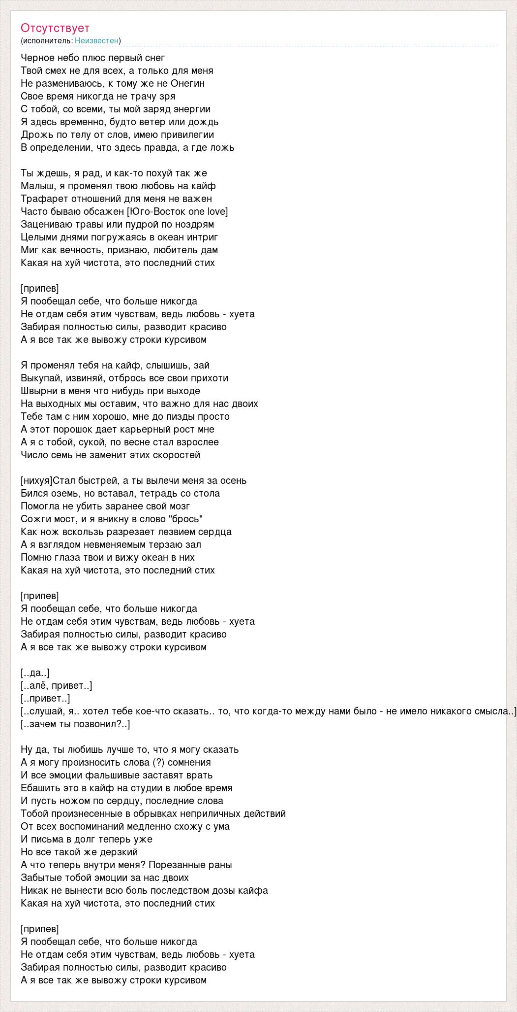 Черное небо плюс первый снег Твой смех не для всех, а только для меня Не размениваюсь, к тому же не Онегин Свое время никогда не трачу зря С тобой, со всеми, ты мой заряд энергии Я здесь временно, будто ветер или дождь Дрожь по телу от слов, имею привилегии В определении, что здесь правда, а где ложь Ты ждешь, я рад, и как-то похуй так же Малыш, я променял твою любовь на кайф Трафарет отношений для меня не важен Часто бываю обсажен [Юго-Восток one love] Зацениваю травы или пудрой по ноздрям Целыми днями погружаясь в океан интриг Миг как вечность, признаю, любитель дам Какая на хуй чистота, это последний стих [припев] Я пообещал себе, что больше никогда Не отдам себя этим чувствам, ведь любовь - хуета Забирая полностью силы, разводит красиво А я все так же вывожу строки курсивом Я променял тебя на кайф, слышишь, зай Выкупай, извиняй, отбрось все свои прихоти Швырни в меня что нибудь при выходе На выходных мы оставим, что важно для нас двоих Тебе там с ним хорошо, мне до пизды просто А этот порошок дает карьерный рост мне А я с тобой, сукой, по весне стал взрослее Число семь не заменит этих скоростей [нихуя]Стал быстрей, а ты вылечи меня за осень Бился оземь, но вставал, тетрадь со стола Помогла не убить заранее свой мозг Сожги мост, и я вникну в слово "брось" Как нож вскользь разрезает лезвием сердца А я взглядом невменяемым терзаю зал Помню глаза твои и вижу океан в них Какая на хуй чистота, это последний стих [припев] Я пообещал себе, что больше никогда Не отдам себя этим чувствам, ведь любовь - хуета Забирая полностью силы, разводит красиво А я все так же вывожу строки курсивом [..да..] [..алё, привет..] [..привет..] [..слушай, я.. хотел тебе кое-что сказать.. то, что когда-то между нами было - не имело никакого смысла..] [..зачем ты позвонил?..] Ну да, ты любишь лучше то, что я могу сказать А я могу произносить слова (?) сомнения И все эмоции фальшивые заставят врать Ебашить это в кайф на студии в любое время И пусть ножом по сердцу, последние слова Тобой произнесенные в обрывках неприличных действий От всех воспоминаний медленно схожу с ума И письма в долг теперь уже Но все такой же дерзкий А что теперь внутри меня? Порезанные раны Забытые тобой эмоции за нас двоих Никак не вынести всю боль последством дозы кайфа Какая на хуй чистота, это последний стих [припев] Я пообещал себе, что больше никогда Не отдам себя этим чувствам, ведь любовь - хуета Забирая полностью силы, разводит красиво А я все так же вывожу строки курсивом
