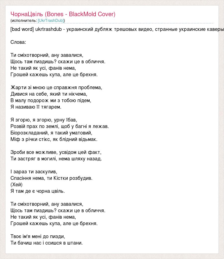 [bad word] ukrtrashdub - украинский дубляж трешовых видео, странные украинские каверы Слова: Ти сміхотворний, ану завалися, Щось там пиздишь? скажи це в обличчя. Не такий як усі, фанів нема, Грошей кажешь купа, але це брехня. Жарти зі мною це справжня проблема, Дивися на себе, який ти нікчема, В малу подорож ми з тобою підем, Я називаю її тягарем. Я згорю, я згорю, урну їбав, Розвій прах по землі, щоб у багні я лежав. Біорозкладаний, я такий уматовий, Міф з річки стікс, як блідний відьмак. Зроби все можливе, усвідом цей факт, Ти застряг в могилі, нема шляху назад. І зараз ти заскулив, Спасіння нема, ти Кістки розбудив. (Хей) Я там де є чорна цвіль. Ти сміхотворний, ану завалися, Щось там пиздишь? скажи це в обличчя. Не такий як усі, фанів нема, Грошей кажешь купа, але це брехня. Твоє ім'я мені до пизди, Ти бачиш нас і ссишся в штани.