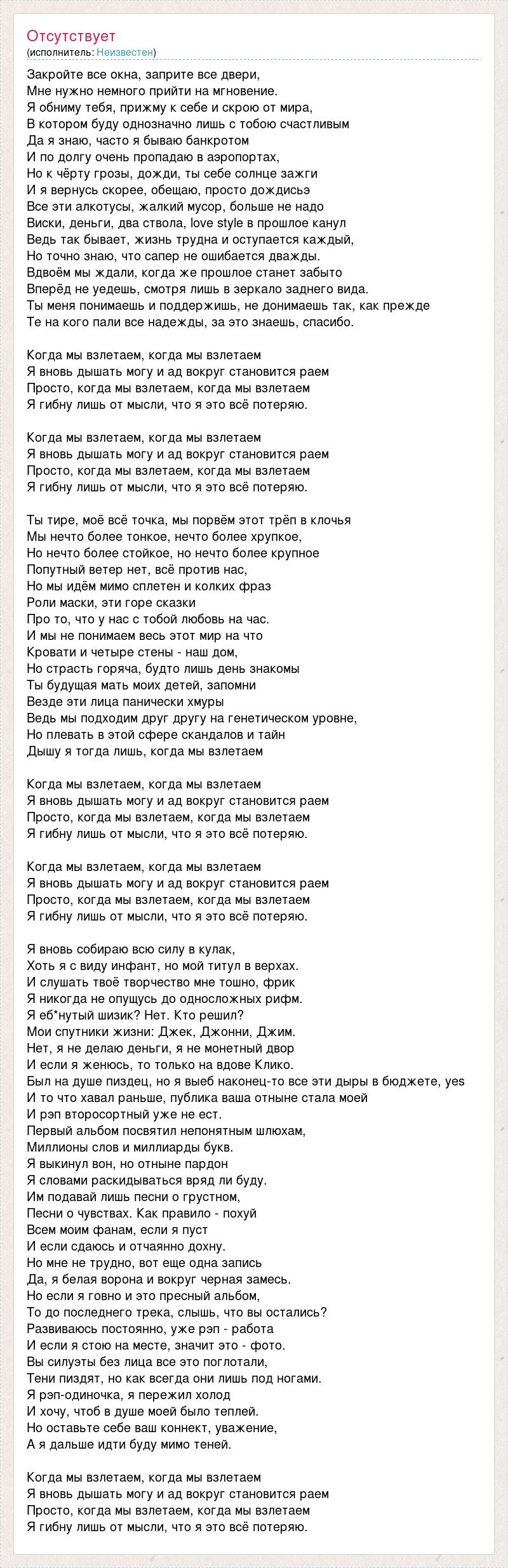 Закройте все окна, заприте все двери, Мне нужно немного прийти на мгновение. Я обниму тебя, прижму к себе и скрою от мира, В котором буду однозначно лишь с тобою счастливым Да я знаю, часто я бываю банкротом И по долгу очень пропадаю в аэропортах, Но к чёрту грозы, дожди, ты себе солнце зажги И я вернусь скорее, обещаю, просто дождисьэ Все эти алкотусы, жалкий мусор, больше не надо Виски, деньги, два ствола, love style в прошлое канул Ведь так бывает, жизнь трудна и оступается каждый, Но точно знаю, что сапер не ошибается дважды. Вдвоём мы ждали, когда же прошлое станет забыто Вперёд не уедешь, смотря лишь в зеркало заднего вида. Ты меня понимаешь и поддержишь, не донимаешь так, как прежде Те на кого пали все надежды, за это знаешь, спасибо. Когда мы взлетаем, когда мы взлетаем Я вновь дышать могу и ад вокруг становится раем Просто, когда мы взлетаем, когда мы взлетаем Я гибну лишь от мысли, что я это всё потеряю. Когда мы взлетаем, когда мы взлетаем Я вновь дышать могу и ад вокруг становится раем Просто, когда мы взлетаем, когда мы взлетаем Я гибну лишь от мысли, что я это всё потеряю. Ты тире, моё всё точка, мы порвём этот трёп в клочья Мы нечто более тонкое, нечто более хрупкое, Но нечто более стойкое, но нечто более крупное Попутный ветер нет, всё против нас, Но мы идём мимо сплетен и колких фраз Роли маски, эти горе сказки Про то, что у нас с тобой любовь на час. И мы не понимаем весь этот мир на что Кровати и четыре стены - наш дом, Но страсть горяча, будто лишь день знакомы Ты будущая мать моих детей, запомни Везде эти лица панически хмуры Ведь мы подходим друг другу на генетическом уровне, Но плевать в этой сфере скандалов и тайн Дышу я тогда лишь, когда мы взлетаем Когда мы взлетаем, когда мы взлетаем Я вновь дышать могу и ад вокруг становится раем Просто, когда мы взлетаем, когда мы взлетаем Я гибну лишь от мысли, что я это всё потеряю. Когда мы взлетаем, когда мы взлетаем Я вновь дышать могу и ад вокруг становится раем Просто, когда мы взлетаем, когда мы взлетаем Я гибну лишь от мысли, что я это всё потеряю. Я вновь собираю всю силу в кулак, Хоть я с виду инфант, но мой титул в верхах. И слушать твоё творчество мне тошно, фрик Я никогда не опущусь до односложных рифм. Я еб*нутый шизик? Нет. Кто решил? Мои спутники жизни: Джек, Джонни, Джим. Нет, я не делаю деньги, я не монетный двор И если я женюсь, то только на вдове Клико. Был на душе пиздец, но я выеб наконец-то все эти дыры в бюджете, yes И то что хавал раньше, публика ваша отныне стала моей И рэп второсортный уже не ест. Первый альбом посвятил непонятным шлюхам, Миллионы слов и миллиарды букв. Я выкинул вон, но отныне пардон Я словами раскидываться вряд ли буду. Им подавай лишь песни о грустном, Песни о чувствах. Как правило - похуй Всем моим фанам, если я пуст И если сдаюсь и отчаянно дохну. Но мне не трудно, вот еще одна запись Да, я белая ворона и вокруг черная замесь. Но если я говно и это пресный альбом, То до последнего трека, слышь, что вы остались? Развиваюсь постоянно, уже рэп - работа И если я стою на месте, значит это - фото. Вы силуэты без лица все это поглотали, Тени пиздят, но как всегда они лишь под ногами. Я рэп-одиночка, я пережил холод И хочу, чтоб в душе моей было теплей. Но оставьте себе ваш коннект, уважение, А я дальше идти буду мимо теней. Когда мы взлетаем, когда мы взлетаем Я вновь дышать могу и ад вокруг становится рае