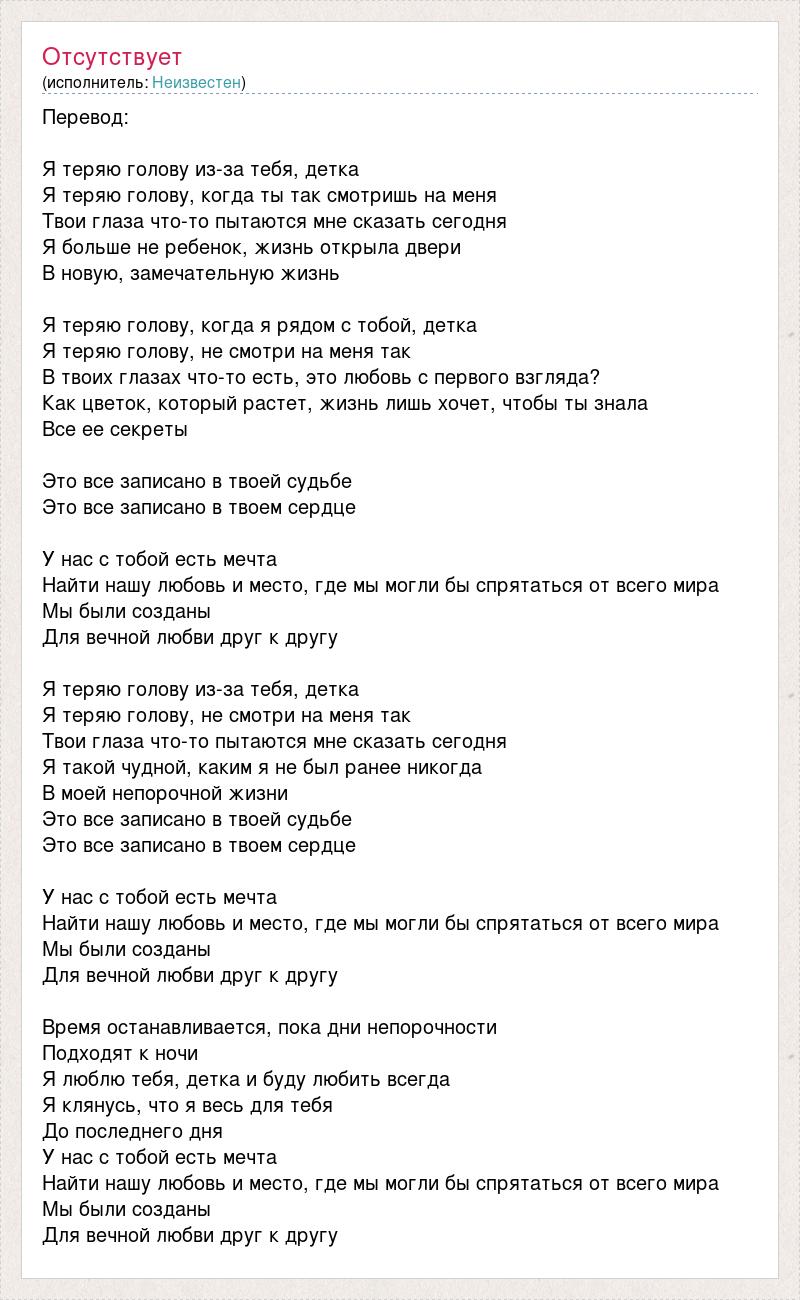 Перевод: Я теряю голову из-за тебя, детка Я теряю голову, когда ты так смотришь на меня Твои глаза что-то пытаются мне сказать сегодня Я больше не ребенок, жизнь открыла двери В новую, замечательную жизнь Я теряю голову, когда я рядом с тобой, детка Я теряю голову, не смотри на меня так В твоих глазах что-то есть, это любовь с первого взгляда? Как цветок, который растет, жизнь лишь хочет, чтобы ты знала Все ее секреты Это все записано в твоей судьбе Это все записано в твоем сердце У нас с тобой есть мечта Найти нашу любовь и место, где мы могли бы спрятаться от всего мира Мы были созданы Для вечной любви друг к другу Я теряю голову из-за тебя, детка Я теряю голову, не смотри на меня так Твои глаза что-то пытаются мне сказать сегодня Я такой чудной, каким я не был ранее никогда В моей непорочной жизни Это все записано в твоей судьбе Это все записано в твоем сердце У нас с тобой есть мечта Найти нашу любовь и место, где мы могли бы спрятаться от всего мира Мы были созданы Для вечной любви друг к другу Время останавливается, пока дни непорочности Подходят к ночи Я люблю тебя, детка и буду любить всегда Я клянусь, что я весь для тебя До последнего дня У нас с тобой есть мечта Найти нашу любовь и место, где мы могли бы спрятаться от всего мира Мы были созданы Для вечной любви друг к другу