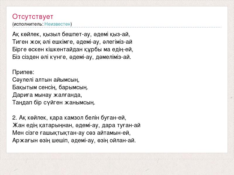 Ақ көйлек, қызыл бешпет-ау, әдемі қыз-ай, Тиген жоқ әлі ешкімге, әдемі-ау, әлегіміз-ай Бірге өскен кішкентайдан құрбы мa едің-ей, Біз сізден әлі күнге, әдемі-ау, дәмеліміз-ай. Припев: Сәулелі алтын айымсың, Бақытым сенсің, барымсың. Дариға мынау жалғанда, Таңдап бір сүйген жанымсың. 2. Ақ көйлек, қара камзол белін буған-ей, Жан едің қатарыңнан, әдемі-ау, дара туған-ай Мен сізге ғашықтықтан-ау сөз айтамын-ей, Аржағын өзің шешіп, әдемі-ау, өзің ойлан-ай.