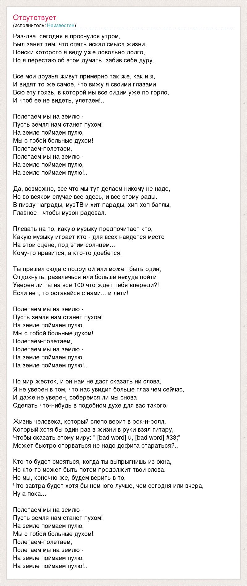 Раз-два, сегодня я проснулся утром, Был занят тем, что опять искал смысл жизни, Поиски которого я веду уже довольно долго, Но я перестаю об этом думать, забив себе дуру. Все мои друзья живут примерно так же, как и я, И видят то же самое, что вижу я своими глазами Всю эту грязь, в которой мы все сидим уже по горло, И чтоб ее не видеть, улетаем!.. Полетаем мы на землю - Пусть земля нам станет пухом! На земле поймаем пулю, Мы с тобой больные духом! Полетаем-полетаем, Полетаем мы на землю - На земле поймаем пулю, На земле поймаем пулю!.. Да, возможно, все что мы тут делаем никому не надо, Но во всяком случае все здесь, и все этому рады. В пизду награды, музТВ и хит-парады, хип-хоп батлы, Главное - чтобы музон радовал. Плевать на то, какую музыку предпочитает кто, Какую музыку играет кто - для всех найдется место На этой сцене, под этим солнцем... Кому-то нравится, а кто-то доебется. Ты пришел сюда с подругой или может быть один, Отдохнуть, развлечься или больше некуда пойти Уверен ли ты на все 100 что ждет тебя впереди?! Если нет, то оставайся с нами... и лети! Полетаем мы на землю - Пусть земля нам станет пухом! На земле поймаем пулю, Мы с тобой больные духом! Полетаем-полетаем, Полетаем мы на землю - На земле поймаем пулю, На земле поймаем пулю!.. Но мир жесток, и он нам не даст сказать ни слова, Я не уверен в том, что нас увидит больше глаз чем сейчас, И даже не уверен, соберемся ли мы снова Сделать что-нибудь в подобном духе для вас такого. Жизнь человека, который слепо верит в рок-н-ролл, Который хотя бы один раз в жизни в руки взял гитару, Чтобы сказать этому миру: " [bad word] u, [bad word] #33;" Может быстро оторваться не надо дофига стараться?.. Кто-то будет смеяться, когда ты выпрыгнишь из окна, Но кто-то может быть потом продолжит твои слова. Но мы, конечно же, будем верить в то, Что завтра будет хотя бы немного лучше, чем сегодня или вчера, Ну а пока... Полетаем мы на землю - Пусть земля нам станет пухом! На земле поймаем пулю, Мы с тобой больные духом! Полетаем-полетаем, Полетаем мы на землю - На земле поймаем пулю, На земле поймаем пулю!..