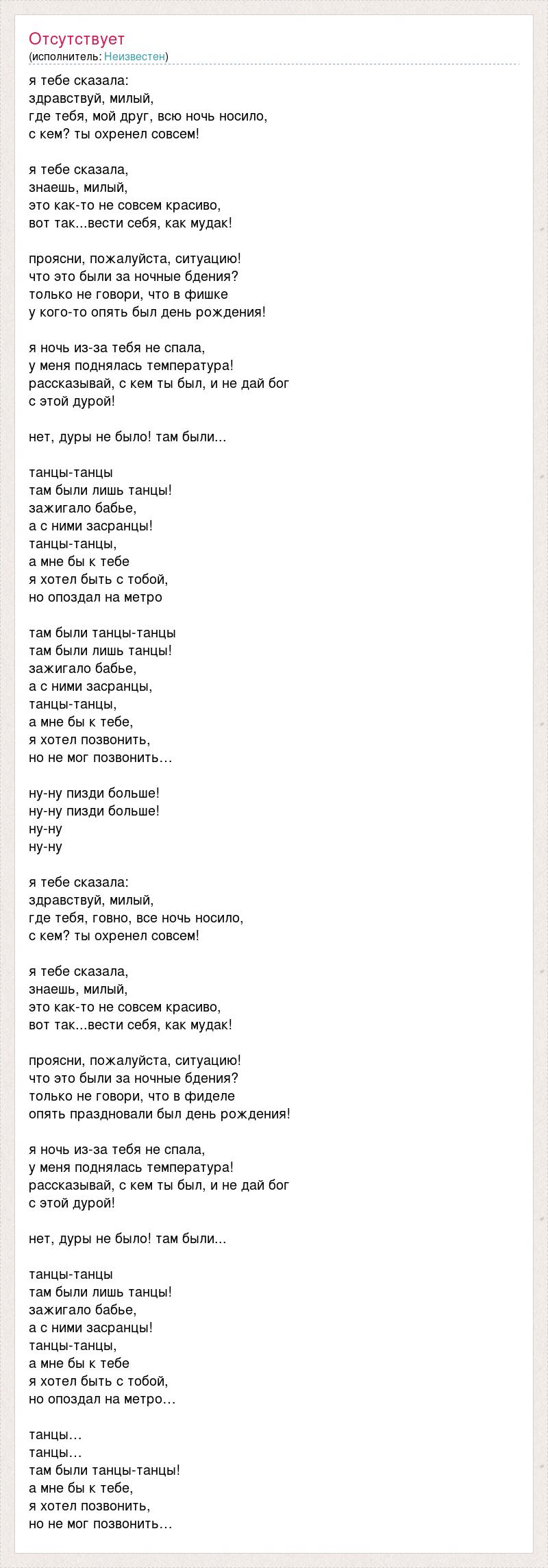 я тебе сказала: здравствуй, милый, где тебя, мой друг, всю ночь носило, с кем? ты охренел совсем! я тебе сказала, знаешь, милый, это как-то не совсем красиво, вот так...вести себя, как мудак! проясни, пожалуйста, ситуацию! что это были за ночные бдения? только не говори, что в фишке у кого-то опять был день рождения! я ночь из-за тебя не спала, у меня поднялась температура! рассказывай, с кем ты был, и не дай бог с этой дурой! нет, дуры не было! там были... танцы-танцы там были лишь танцы! зажигало бабье, а с ними засранцы! танцы-танцы, а мне бы к тебе я хотел быть с тобой, но опоздал на метро там были танцы-танцы там были лишь танцы! зажигало бабье, а с ними засранцы, танцы-танцы, а мне бы к тебе, я хотел позвонить, но не мог позвонить… ну-ну пизди больше! ну-ну пизди больше! ну-ну ну-ну я тебе сказала: здравствуй, милый, где тебя, говно, все ночь носило, с кем? ты охренел совсем! я тебе сказала, знаешь, милый, это как-то не совсем красиво, вот так...вести себя, как мудак! проясни, пожалуйста, ситуацию! что это были за ночные бдения? только не говори, что в фиделе опять праздновали был день рождения! я ночь из-за тебя не спала, у меня поднялась температура! рассказывай, с кем ты был, и не дай бог с этой дурой! нет, дуры не было! там были... танцы-танцы там были лишь танцы! зажигало бабье, а с ними засранцы! танцы-танцы, а мне бы к тебе я хотел быть с тобой, но опоздал на метро… танцы… танцы… там были танцы-танцы! а мне бы к тебе, я хотел позвонить, но не мог позвонить…