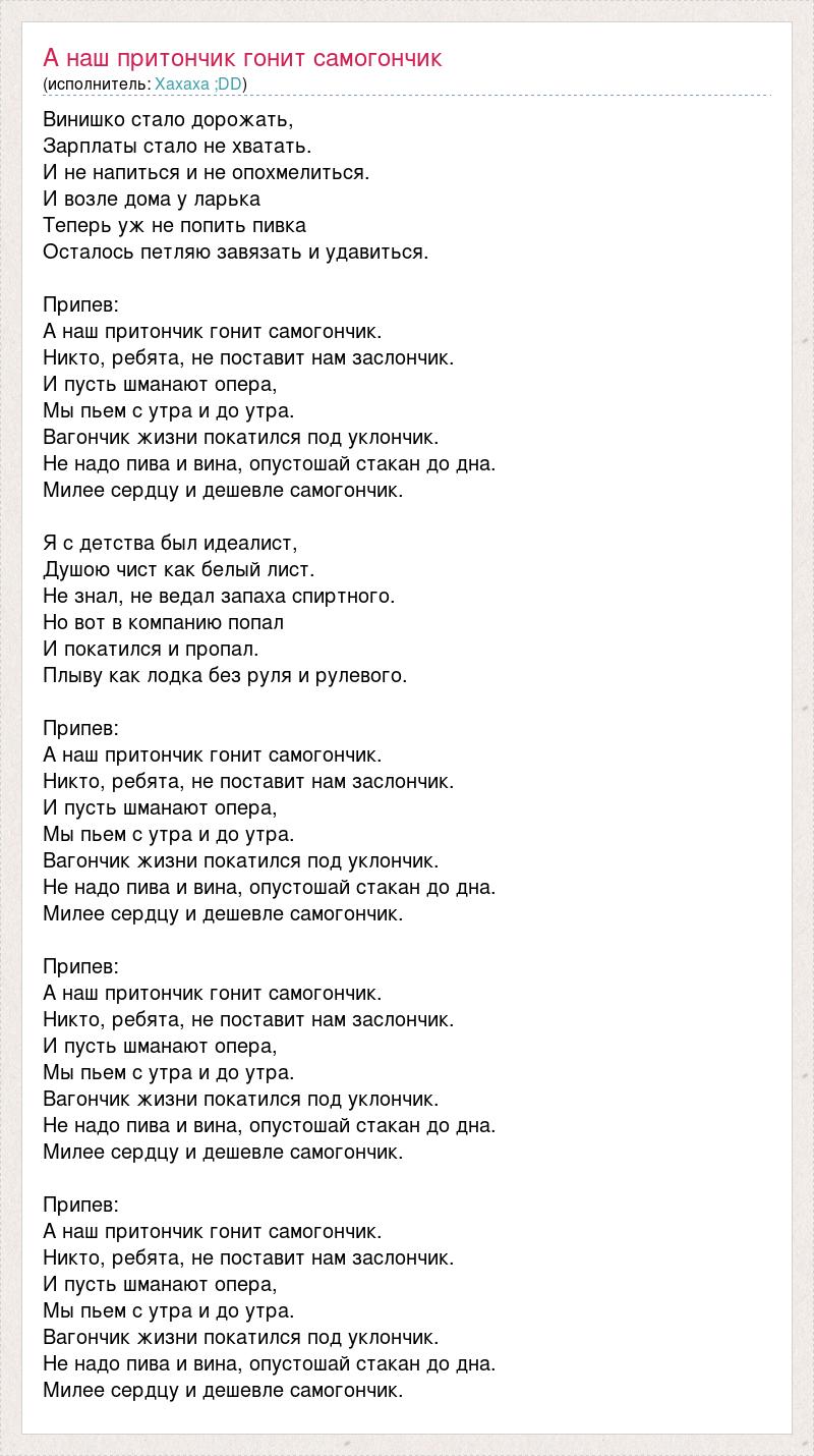 Винишко стало дорожать, Зарплаты стало не хватать. И не напиться и не опохмелиться. И возле дома у ларька Теперь уж не попить пивка Осталось петляю завязать и удавиться. Припев: А наш притончик гонит самогончик. Никто, ребята, не поставит нам заслончик. И пусть шманают опера, Мы пьем с утра и до утра. Вагончик жизни покатился под уклончик. Не надо пива и вина, опустошай стакан до дна. Милее сердцу и дешевле самогончик. Я с детства был идеалист, Душою чист как белый лист. Не знал, не ведал запаха спиртного. Но вот в компанию попал И покатился и пропал. Плыву как лодка без руля и рулевого. Припев: А наш притончик гонит самогончик. Никто, ребята, не поставит нам заслончик. И пусть шманают опера, Мы пьем с утра и до утра. Вагончик жизни покатился под уклончик. Не надо пива и вина, опустошай стакан до дна. Милее сердцу и дешевле самогончик. Припев: А наш притончик гонит самогончик. Никто, ребята, не поставит нам заслончик. И пусть шманают опера, Мы пьем с утра и до утра. Вагончик жизни покатился под уклончик. Не надо пива и вина, опустошай стакан до дна. Милее сердцу и дешевле самогончик. Припев: А наш притончик гонит самогончик. Никто, ребята, не поставит нам заслончик. И пусть шманают опера, Мы пьем с утра и до утра. Вагончик жизни покатился под уклончик. Не надо пива и вина, опустошай стакан до дна. Милее сердцу и дешевле самогончик.