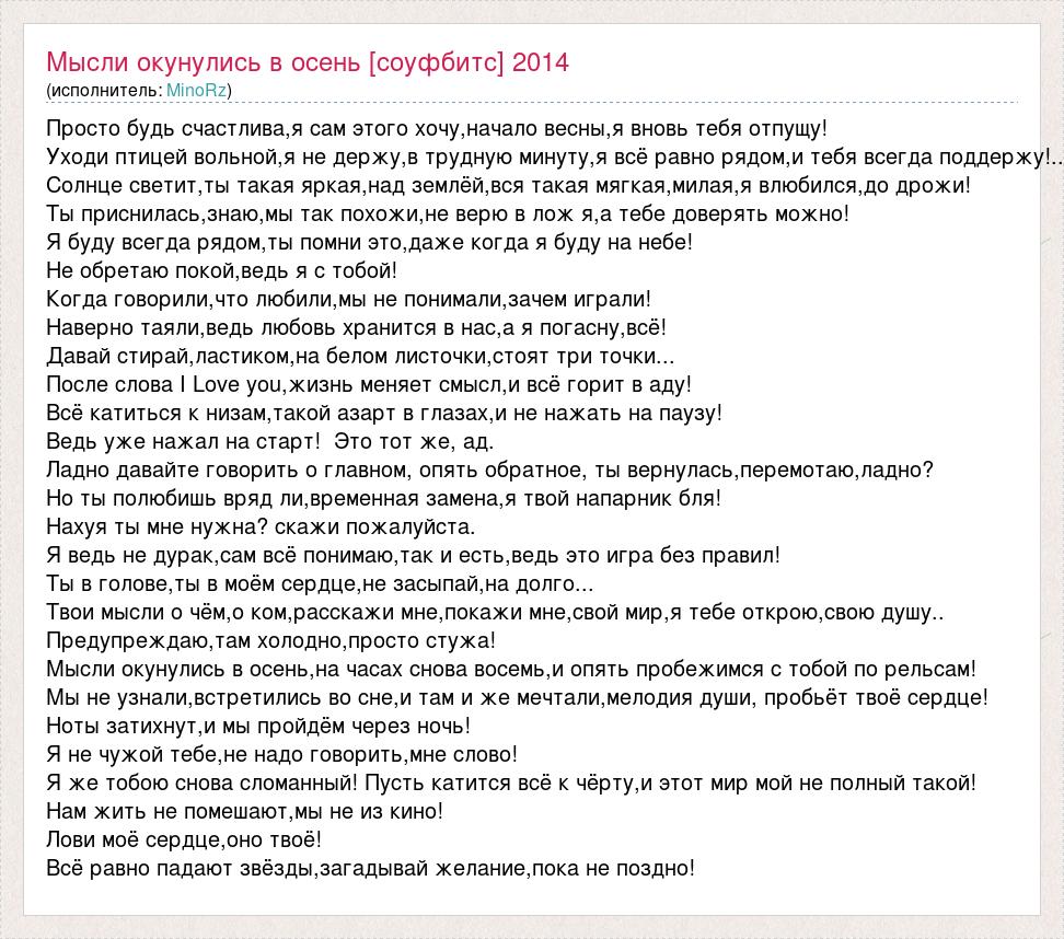 Просто будь счастлива,я сам этого хочу,начало весны,я вновь тебя отпущу! Уходи птицей вольной,я не держу,в трудную минуту,я всё равно рядом,и тебя всегда поддержу!.. Солнце светит,ты такая яркая,над землёй,вся такая мягкая,милая,я влюбился,до дрожи! Ты приснилась,знаю,мы так похожи,не верю в лож я,а тебе доверять можно! Я буду всегда рядом,ты помни это,даже когда я буду на небе! Не обретаю покой,ведь я с тобой! Когда говорили,что любили,мы не понимали,зачем играли! Наверно таяли,ведь любовь хранится в нас,а я погасну,всё! Давай стирай,ластиком,на белом листочки,стоят три точки... После слова I Love you,жизнь меняет смысл,и всё горит в аду! Всё катиться к низам,такой азарт в глазах,и не нажать на паузу! Ведь уже нажал на старт! Это тот же, ад. Ладно давайте говорить о главном, опять обратное, ты вернулась,перемотаю,ладно? Но ты полюбишь вряд ли,временная замена,я твой напарник бля! Нахуя ты мне нужна? скажи пожалуйста. Я ведь не дурак,сам всё понимаю,так и есть,ведь это игра без правил! Ты в голове,ты в моём сердце,не засыпай,на долго... Твои мысли о чём,о ком,расскажи мне,покажи мне,свой мир,я тебе открою,свою душу.. Предупреждаю,там холодно,просто стужа! Мысли окунулись в осень,на часах снова восемь,и опять пробежимся с тобой по рельсам! Мы не узнали,встретились во сне,и там и же мечтали,мелодия души, пробьёт твоё сердце! Ноты затихнут,и мы пройдём через ночь! Я не чужой тебе,не надо говорить,мне слово! Я же тобою снова сломанный! Пусть катится всё к чёрту,и этот мир мой не полный такой! Нам жить не помешают,мы не из кино! Лови моё сердце,оно твоё! Всё равно падают звёзды,загадывай желание,пока не поздно!