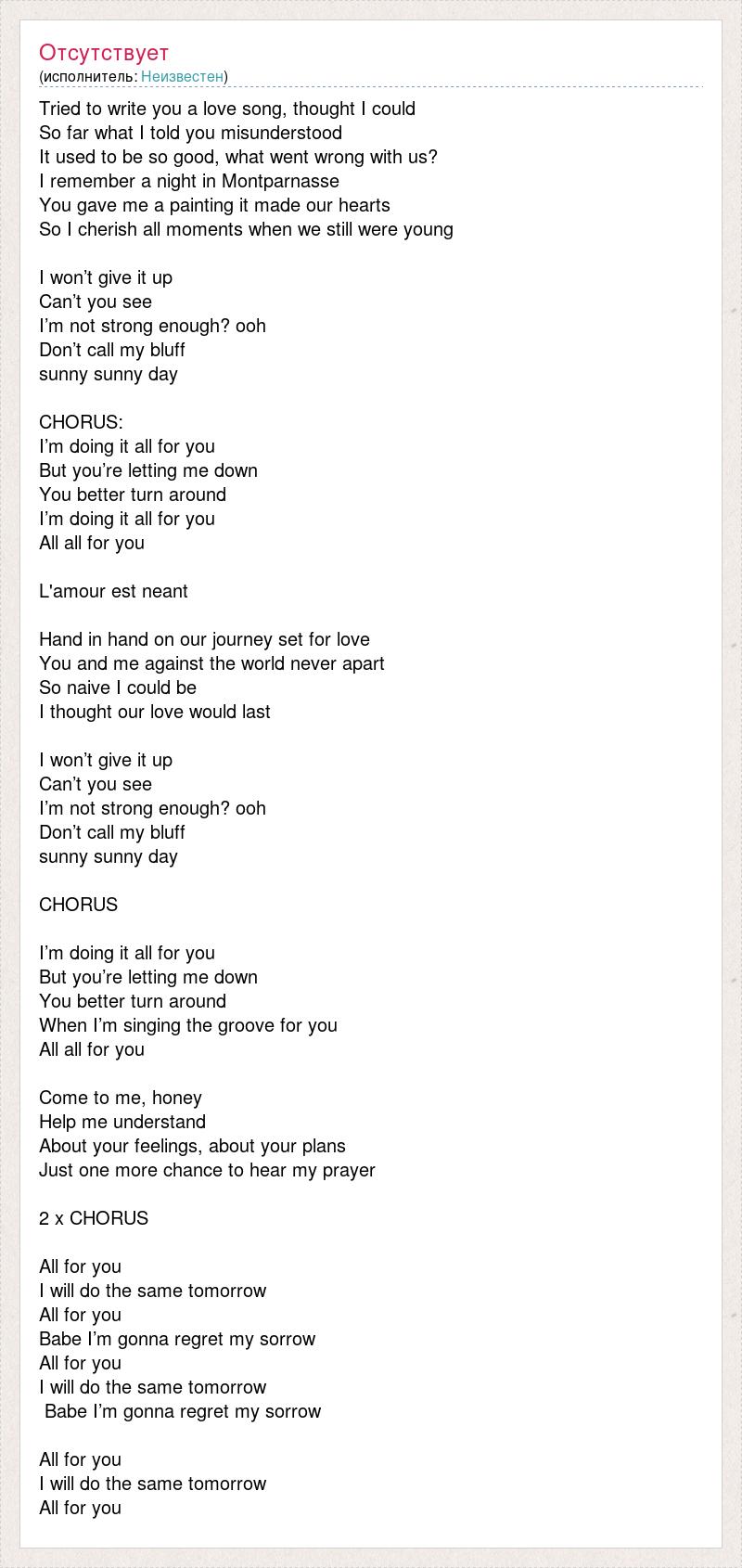 Tried to write you a love song, thought I could So far what I told you misunderstood It used to be so good, what went wrong with us? I remember a night in Montparnasse You gave me a painting it made our hearts So I cherish all moments when we still were young I won’t give it up Can’t you see I’m not strong enough? ooh Don’t call my bluff sunny sunny day CHORUS: I’m doing it all for you But you’re letting me down You better turn around I’m doing it all for you All all for you L'amour est neant Hand in hand on our journey set for love You and me against the world never apart So naive I could be I thought our love would last I won’t give it up Can’t you see I’m not strong enough? ooh Don’t call my bluff sunny sunny day CHORUS I’m doing it all for you But you’re letting me down You better turn around When I’m singing the groove for you All all for you Come to me, honey Help me understand About your feelings, about your plans Just one more chance to hear my prayer 2 x CHORUS All for you I will do the same tomorrow All for you Babe I’m gonna regret my sorrow All for you I will do the same tomorrow Babe I’m gonna regret my sorrow All for you I will do the same tomorrow All for you