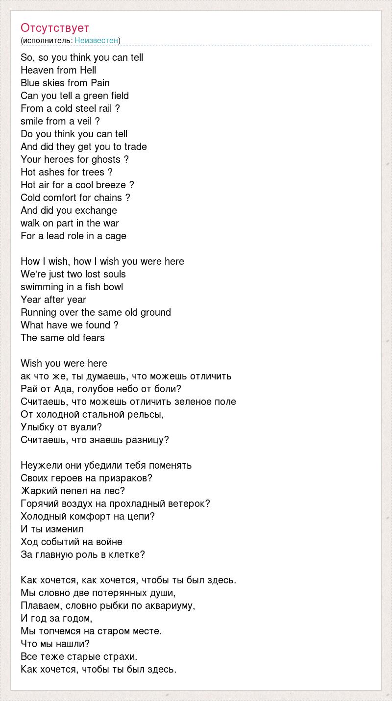 So, so you think you can tell Heaven from Hell Blue skies from Pain Can you tell a green field From a cold steel rail ? smile from a veil ? Do you think you can tell And did they get you to trade Your heroes for ghosts ? Hot ashes for trees ? Hot air for a cool breeze ? Cold comfort for chains ? And did you exchange walk on part in the war For a lead role in a cage How I wish, how I wish you were here We're just two lost souls swimming in a fish bowl Year after year Running over the same old ground What have we found ? The same old fears Wish you were here ак что же, ты думаешь, что можешь отличить Рай от Ада, голубое небо от боли? Считаешь, что можешь отличить зеленое поле От холодной стальной рельсы, Улыбку от вуали? Считаешь, что знаешь разницу? Неужели они убедили тебя поменять Своих героев на призраков? Жаркий пепел на лес? Горячий воздух на прохладный ветерок? Холодный комфорт на цепи? И ты изменил Ход событий на войне За главную роль в клетке? Как хочется, как хочется, чтобы ты был здесь. Мы словно две потерянных души, Плаваем, словно рыбки по аквариуму, И год за годом, Мы топчемся на старом месте. Что мы нашли? Все теже старые страхи. Как хочется, чтобы ты был здесь.