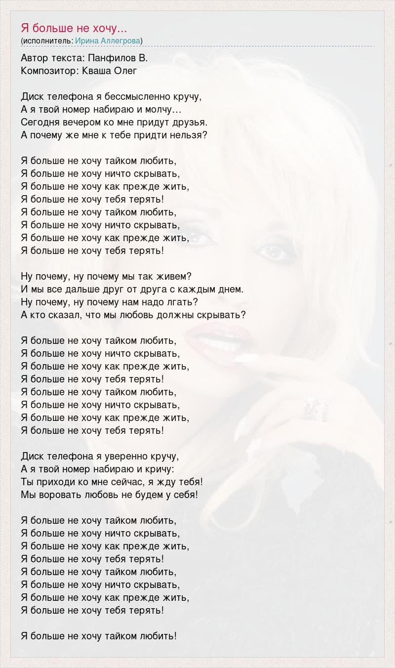 Автор текста: Панфилов В. Композитор: Кваша Олег Диск телефона я бессмысленно кручу, А я твой номер набираю и молчу… Сегодня вечером ко мне придут друзья. А почему же мне к тебе придти нельзя? Я больше не хочу тайком любить, Я больше не хочу ничто скрывать, Я больше не хочу как прежде жить, Я больше не хочу тебя терять! Я больше не хочу тайком любить, Я больше не хочу ничто скрывать, Я больше не хочу как прежде жить, Я больше не хочу тебя терять! Ну почему, ну почему мы так живем? И мы все дальше друг от друга с каждым днем. Ну почему, ну почему нам надо лгать? А кто сказал, что мы любовь должны скрывать? Я больше не хочу тайком любить, Я больше не хочу ничто скрывать, Я больше не хочу как прежде жить, Я больше не хочу тебя терять! Я больше не хочу тайком любить, Я больше не хочу ничто скрывать, Я больше не хочу как прежде жить, Я больше не хочу тебя терять! Диск телефона я уверенно кручу, А я твой номер набираю и кричу: Ты приходи ко мне сейчас, я жду тебя! Мы воровать любовь не будем у себя! Я больше не хочу тайком любить, Я больше не хочу ничто скрывать, Я больше не хочу как прежде жить, Я больше не хочу тебя терять! Я больше не хочу тайком любить, Я больше не хочу ничто скрывать, Я больше не хочу как прежде жить, Я больше не хочу тебя терять! Я больше не хочу тайком любить!