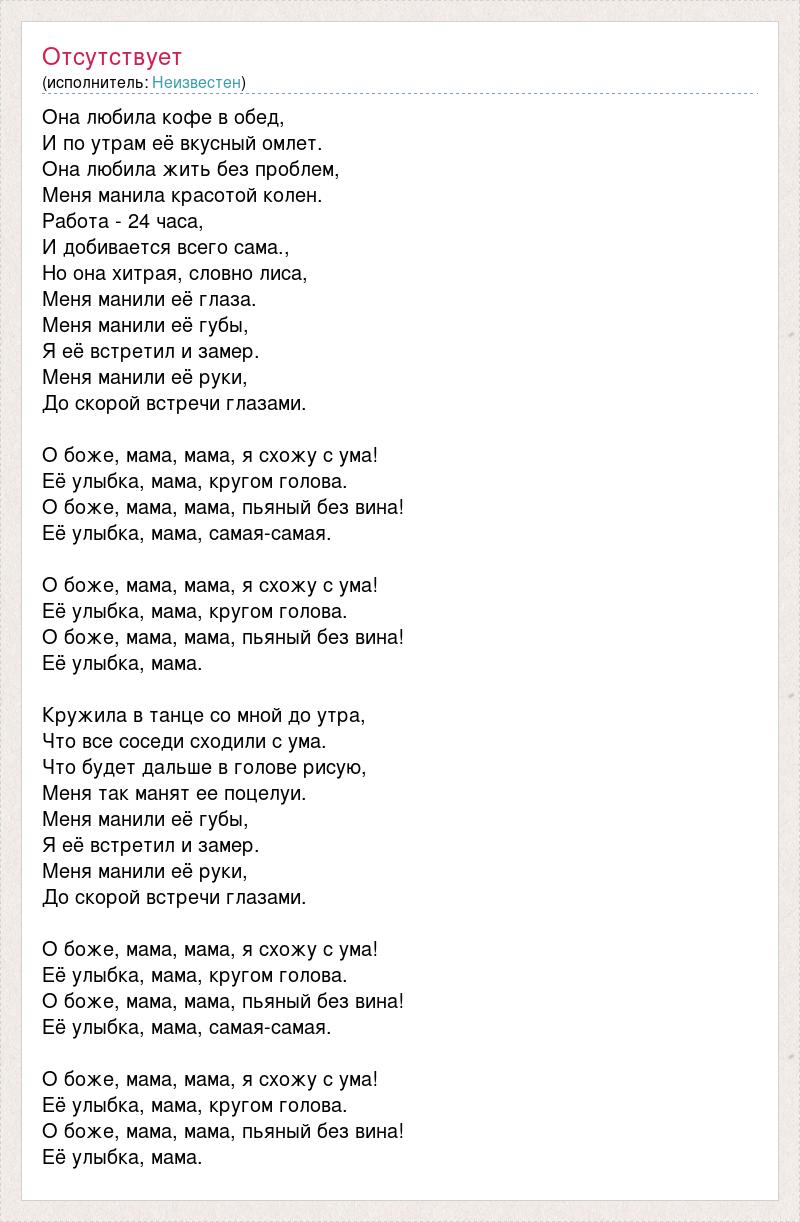 Она любила кофе в обед, И по утрам её вкусный омлет. Она любила жить без проблем, Меня манила красотой колен. Работа - 24 часа, И добивается всего сама., Но она хитрая, словно лиса, Меня манили её глаза. Меня манили её губы, Я её встретил и замер. Меня манили её руки, До скорой встречи глазами. О боже, мама, мама, я схожу с ума! Её улыбка, мама, кругом голова. О боже, мама, мама, пьяный без вина! Её улыбка, мама, самая-самая. О боже, мама, мама, я схожу с ума! Её улыбка, мама, кругом голова. О боже, мама, мама, пьяный без вина! Её улыбка, мама. Кружила в танце со мной до утра, Что все соседи сходили с ума. Что будет дальше в голове рисую, Меня так манят ее поцелуи. Меня манили её губы, Я её встретил и замер. Меня манили её руки, До скорой встречи глазами. О боже, мама, мама, я схожу с ума! Её улыбка, мама, кругом голова. О боже, мама, мама, пьяный без вина! Её улыбка, мама, самая-самая. О боже, мама, мама, я схожу с ума! Её улыбка, мама, кругом голова. О боже, мама, мама, пьяный без вина! Её улыбка, мама.